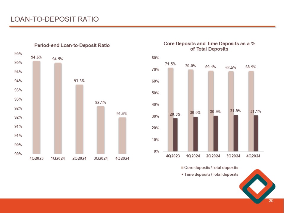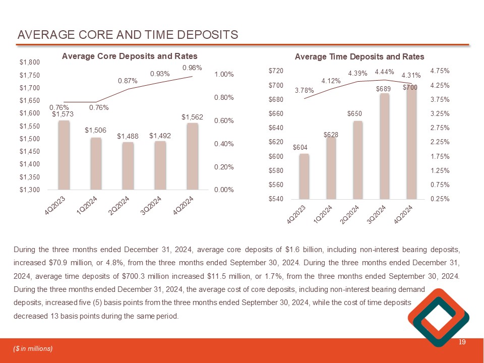 AVERAGE CORE AND TIME DEPOSITS 19 $1,573 $1,506 $1,488 $1,492 $1,562 0.76% 0.76% 0.87% 0.93% 0.98% 0.00% 0.20% 0.40% 0.60% 0.80% 1.00% $1,300 $1,350 $1,400 $1,450 $1,500 $1,550 $1,600 $1,650 $1,700 $1,750 $1,800 Average Core Deposits and Rates During the three months ended December 31 , 2024 , average core deposits of $ 1 . 6 billion, including non - interest bearing deposits, increased $ 70 . 9 million , or 4 . 8 % , from the three months ended September 30 , 2024 . During the three months ended December 31 , 2024 , average time deposits of $ 700 . 3 million increased $ 11 . 5 million, or 1 . 7 % , from the three months ended September 30 , 2024 . During the three months ended December 31 , 2024 , the average cost of core deposits, including non - interest bearing demand deposits, increased five ( 5 ) basis points from the three months ended September 30 , 2024 , while the cost of time deposits decreased 13 basis points during the same period . ($ in millions) $604 $628 $650 $689 $700 3.78% 4.12% 4.39% 4.44% 4.31% 0.25% 0.75% 1.25% 1.75% 2.25% 2.75% 3.25% 3.75% 4.25% 4.75% $540 $560 $580 $600 $620 $640 $660 $680 $700 $720 Average Time Deposits and Rates