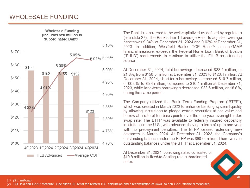 WHOLESALE FUNDING 21 $156 $152 $155 $152 $123 4.83% 4.91% 5.00% 5.05% 5.04% 4.70% 4.75% 4.80% 4.85% 4.90% 4.95% 5.00% 5.05% 5.10% 4Q2023 1Q2024 2Q2024 3Q2024 4Q2024 $100 $110 $120 $130 $140 $150 $160 $170 Wholesale Funding (Includes $20 million in Subordinated Debt ) (1) FHLB Advances Average COF The Bank is considered to be well - capitalized as defined by regulators ( see slide 27 ) . The Bank’s Tier 1 Leverage Ratio to adjusted average assets was 9 . 34 % at December 31 , 2024 and 9 . 62 % at December 31 , 2023 . In addition, Westfield Bank’s TCE Ratio ( 2 ) , a non - GAAP financial measure, exceeds the Federal Home Loan Bank of Boston (“FHLB”) requirements to continue to utilize the FHLB as a funding source . At December 31 , 2024 , total borrowings decreased $ 33 . 4 million, or 21 . 3 % , from $ 156 . 5 million at December 31 , 2023 to $ 123 . 1 million . At December 31 , 2024 , short - term borrowings decreased $ 10 . 7 million, or 66 . 5 % , to $ 5 . 4 million , compared to $ 16 . 1 million at December 31 , 2023 , while long - term borrowings decreased $ 22 . 6 million, or 18 . 8 % , during the same period . The Company utilized the Bank Term Funding Program (“BTFP”), which was created in March 2023 to enhance banking system liquidity by allowing institutions to pledge certain securities at par value and borrow at a rate of ten basis points over the one - year overnight index swap rate . The BTFP was available to federally insured depository institutions in the U . S . , with advances having a term of up to one year with no prepayment penalties . The BTFP ceased extending new advances in March 2024 . At December 31 , 2023 , the Company’s outstanding balance under the BTFP was $ 90 . 0 million . There was no outstanding balances under the BTFP at December 31 , 2024 . At December 31 , 2024 , borrowings also consisted of $ 19 . 8 million in fixed - to - floating rate subordinated notes . (1) ($ in millions) (2) TCE is a non - GAAP measure. See slides 30 - 32 for the related TCE calculation and a reconciliation of GAAP to non - GAAP financial measures .