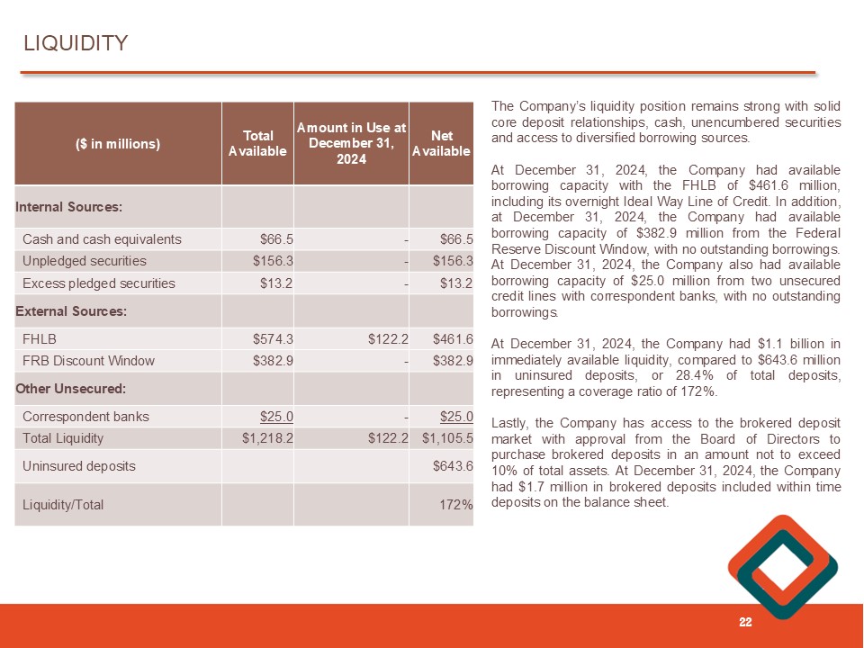 22 The Company’s liquidity position remains strong with solid core deposit relationships, cash, unencumbered securities and access to diversified borrowing sources . At December 31 , 2024 , the Company had available borrowing capacity with the FHLB of $ 461 . 6 million, including its overnight Ideal Way Line of Credit . In addition, at December 31 , 2024 , the Company had available borrowing capacity of $ 382 . 9 million from the Federal Reserve Discount Window, with no outstanding borrowings . At December 31 , 2024 , the Company also had available borrowing capacity of $ 25 . 0 million from two unsecured credit lines with correspondent banks, with no outstanding borrowings . At December 31 , 2024 , the Company had $ 1 . 1 billion in immediately available liquidity, compared to $ 643 . 6 million in uninsured deposits, or 28 . 4 % of total deposits, representing a coverage ratio of 172 % . Lastly, the Company has access to the brokered deposit market with approval from the Board of Directors to purchase brokered deposits in an amount not to exceed 10 % of total assets . At December 31 , 2024 , the Company had $ 1 . 7 million in brokered deposits included within time deposits on the balance sheet . LIQUIDITY Net Available Amount in Use at December 31 , 2024 Total Available ($ in millions) Internal Sources: $66.5 - $66.5 Cash and cash equivalents $156.3 - $156.3 Unpledged securities $ 13.2 - $ 13.2 Excess pledged securities External Sources: $461.6 $122.2 $574.3 FHLB $382.9 - $382.9 FRB Discount Window Other Unsecured: $25.0 - $25.0 Correspondent banks $ 1,105.5 $ 122.2 $ 1,218.2 Total Liquidity $643.6 Uninsured deposits 172% Liquidity/Total