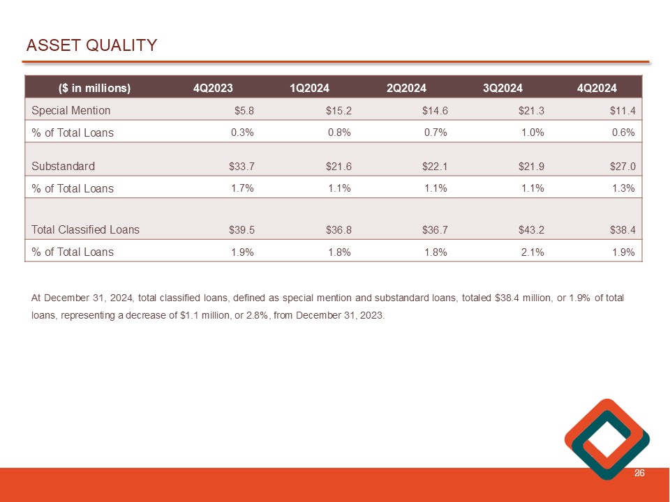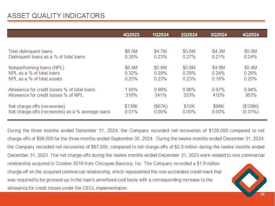 ASSET QUALITY INDICATORS 24 4Q2024 3Q2024 2Q2024 1Q2024 4Q2023 $5.0M $4.3M $5.6M $4.7M $6.0M Total delinquent loans 0.24% 0.21% 0.27% 0.23% 0.30% Delinquent loans as a % of total loans $5.4M $4.9M $5.8M $5.8M $6.4M Nonperforming loans (NPL) 0.26% 0.24% 0.29% 0.29% 0.32% NPL as a % of total loans 0.20% 0.18% 0.23% 0.23% 0.25% NPL as a % of total assets 0.94% 0.97% 0.96% 0.98% 1.00% Allowance for credit losses % of total loans 363% 410% 333% 341% 316% Allowance for credit losses % of NPL ($128K) $98K $10K ($67K) $136K Net charge - offs (recoveries) (0.01%) 0.00% 0.00% 0.00% 0.01% Net charge - offs (recoveries) as a % average loans During the three months ended December 31 , 2024 , the Company recorded net recoveries of $ 128 , 000 compared to net charge - offs of $ 98 , 000 for the three months ended September 30 , 2024 . During the twelve months ended December 31 , 2024 , the Company recorded net recoveries of $ 87 , 000 , compared to net charge - offs of $ 2 . 0 million during the twelve months ended December 31 , 2023 . The net charge - offs during the twelve months ended December 31 , 2023 were related to one commercial relationship acquired in October 2016 from Chicopee Bancorp, Inc . The Company recorded a $ 1 . 9 million charge - off on the acquired commercial relationship , which represented the non - accretable credit mark that was required to be grossed - up to the loan’s amortized cost basis with a corresponding increase to the allowance for credit losses under the CECL implementation .