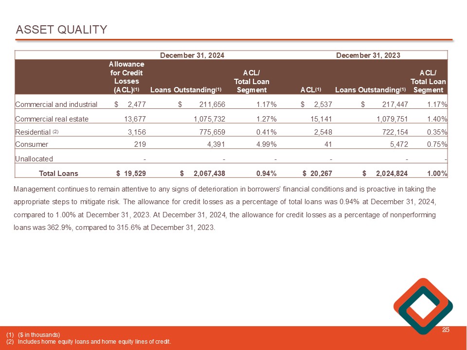 ASSET QUALITY 25 Management continues to remain attentive to any signs of deterioration in borrowers’ financial conditions and is proactive in taking the appropriate steps to mitigate risk . The allowance for credit losses as a percentage of total loans was 0 . 94 % at December 31 , 2024 , compared to 1 . 00 % at December 31 , 2023 . At December 31 , 2024 , the allowance for credit losses as a percentage of nonperforming loans was 362 . 9 % , compared to 315 . 6 % at December 31 , 2023 . December 31, 2023 December 31, 2024 ACL / Total Loan Segment Loans Outstanding (1) ACL (1) ACL / Total Loan Segment Loans Outstanding (1) Allowance for Credit Losses (ACL) (1) 1.17% $ 217,447 $ 2,537 1.17% $ 211,656 $ 2,477 Commercial and industrial 1.40% 1,079,751 15,141 1.27% 1,075,732 13,677 Commercial real estate 0.35% 722,154 2,548 0.41% 775,659 3,156 Residential (2) 0.75% 5,472 41 4.99% 4,391 219 Consumer - - - - - - Unallocated 1.00% $ 2,024,824 $ 20,267 0.94% $ 2,067,438 $ 19,529 Total Loans (1) ( $ in thousands) (2) Includes home equity loans and home equity lines of credit .
