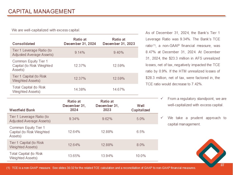 CAPITAL MANAGEMENT 27 We are well - capitalized with excess capital. Ratio at December 31, 2023 Ratio at December 31, 2024 Consolidated 9.40% 9.14% Tier 1 Leverage Ratio (to Adjusted Average Assets) 12.59% 12.37% Common Equity Tier 1 Capital (to Risk Weighted Assets) 12.59% 12.37% Tier 1 Capital (to Risk Weighted Assets) 14.67% 14.38% Total Capital (to Risk Weighted Assets) As of December 31 , 2024 , the Bank’s Tier 1 Leverage Ratio was 9 . 34 % . The Bank’s TCE ratio ( 1 ) , a non - GAAP financial measure, was 8 . 47 % at December 31 , 2024 . At December 31 , 2024 , the $ 23 . 3 million in AFS unrealized losses, net of tax, negatively impacted the TCE ratio by 0 . 9 % . If the HTM unrealized losses of $ 28 . 3 million, net of tax, were factored in, the TCE ratio would decrease to 7 . 42 % . Well Capitalized Ratio at December 31, 2023 Ratio at December 31, 2024 Westfield Bank 5.0% 9.62% 9.34% Tier 1 Leverage Ratio (to Adjusted Average Assets) 6.5% 12.88% 12.64% Common Equity Tier 1 Capital (to Risk Weighted Assets) 8.0% 12.88% 12.64% Tier 1 Capital (to Risk Weighted Assets) 10.0% 13.94% 13.65% Total Capital (to Risk Weighted Assets) (1) TCE is a non - GAAP measure. See slides 30 - 32 for the related TCE calculation and a reconciliation of GAAP to non - GAAP financial measures . x From a regulatory standpoint, we are well - capitalized with excess capital . x We take a prudent approach to capital management .