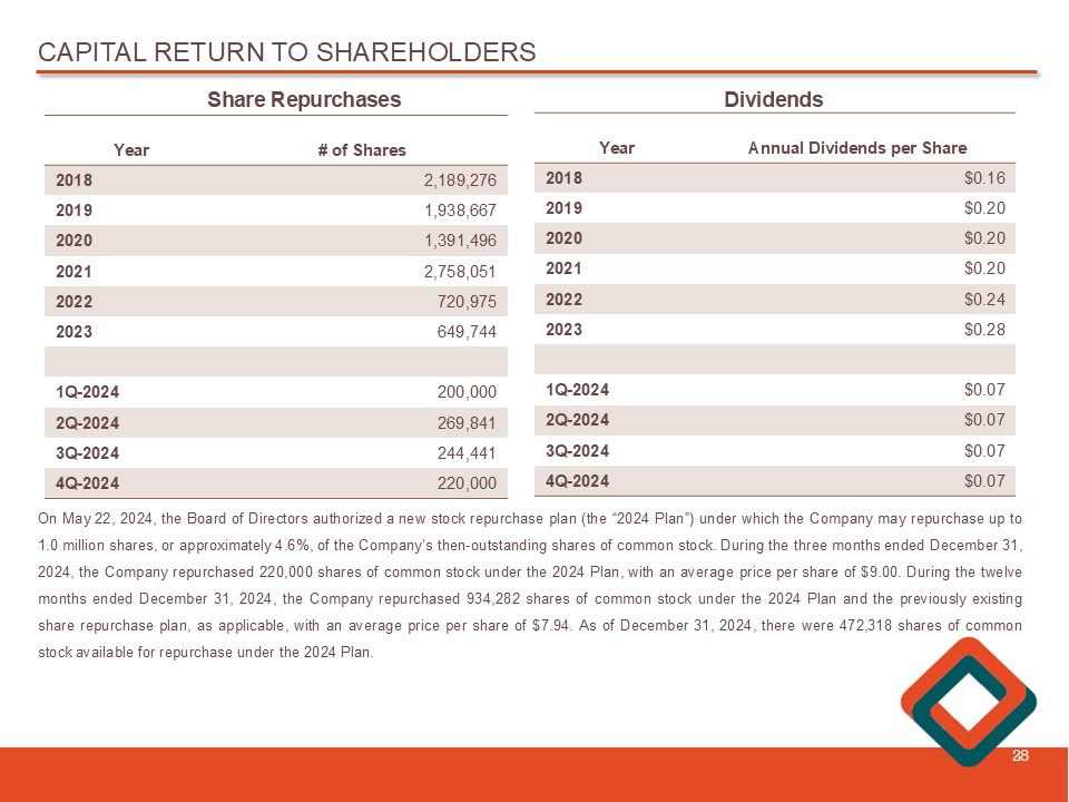 CAPITAL RETURN TO SHAREHOLDERS 28 # of Shares Year 2,189,276 2018 1,938,667 2019 1,391,496 2020 2,758,051 2021 720,975 2022 649,744 2023 200,000 1Q - 2024 269,841 2Q - 2024 244,441 3Q - 2024 220,000 4Q - 2024 Annual Dividends per Share Year $0.16 2018 $0.20 2019 $0.20 2020 $0.20 2021 $0.24 2022 $0.28 2023 $0.07 1Q - 2024 $0.07 2Q - 2024 $0.07 3Q - 2024 $0.07 4Q - 2024 Share Repurchases Dividends On May 22 , 2024 , the Board of Directors authorized a new stock repurchase plan (the “ 2024 Plan”) under which the Company may repurchase up to 1 . 0 million shares, or approximately 4 . 6 % , of the Company’s then - outstanding shares of common stock . During the three months ended December 31 , 2024 , the Company repurchased 220 , 000 shares of common stock under the 2024 Plan, with an average price per share of $ 9 . 00 . During the twelve months ended December 31 , 2024 , the Company repurchased 934 , 282 shares of common stock under the 2024 Plan and the previously existing share repurchase plan, as applicable, with an average price per share of $ 7 . 94 . As of December 31 , 2024 , there were 472 , 318 shares of common stock available for repurchase under the 2024 Plan .