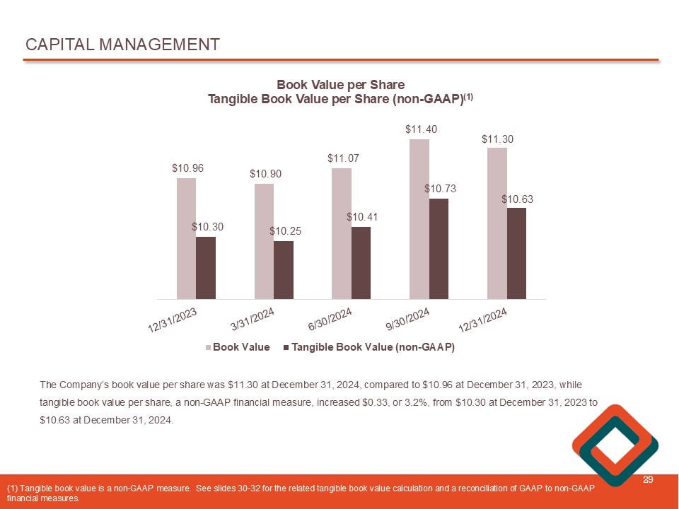 CAPITAL MANAGEMENT 29 $10.96 $10.90 $11.07 $11.40 $11.30 $10.30 $10.25 $10.41 $10.73 $10.63 Book Value per Share Tangible Book Value per Share (non - GAAP) (1) Book Value Tangible Book Value (non-GAAP) The Company’s book value per share was $11.30 at December 31, 2024, compared to $10.96 at December 31, 2023, while tangible book value per share, a non - GAAP financial measure, increased $0.33, or 3.2%, from $10.30 at December 31, 2023 to $10.63 at December 31, 2024. ( 1) Tangible book value is a non - GAAP measure. See slides 30 - 32 for the related tangible book value calculation and a reconcilia tion of GAAP to non - GAAP financial measures.
