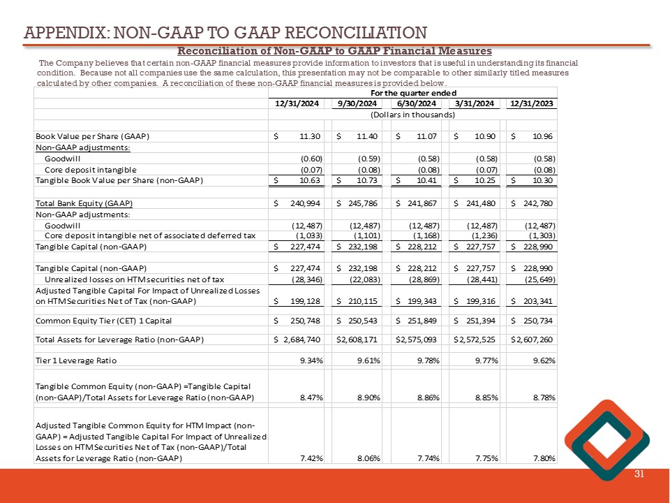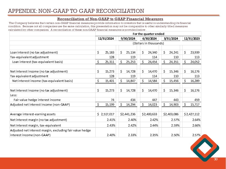 APPENDIX: NON - GAAP TO GAAP RECONCILIATION 30 Reconciliation of Non - GAAP to GAAP Financial Measures The Company believes that certain non - GAAP financial measures provide information to investors that is useful in understanding i ts financial condition. Because not all companies use the same calculation, this presentation may not be comparable to other similarly title d measures calculated by other companies. A reconciliation of these non - GAAP financial measures is provided below. 12/31/2024 9/30/2024 6/30/2024 3/31/2024 12/31/2023 Loan interest (no tax adjustment) 25,183$ 25,134$ 24,340$ 24,241$ 23,939$ Tax-equivalent adjustment 128 119 114 110 113 Loan interest (tax-equivalent basis) 25,311$ 25,253$ 24,454$ 24,351$ 24,052$ Net interest income (no tax adjustment) 15,273$ 14,728$ 14,470$ 15,346$ 16,176$ Tax equivalent adjustment 128 119 114 110 113 Net interest income (tax-equivalent basis) 15,401$ 14,847$ 14,584$ 15,456$ 16,289$ Net interest income (no tax adjustment) 15,273$ 14,728$ 14,470$ 15,346$ 16,176$ Less: Fair value hedge interest income 74 434 447 443 459 Adjusted net interest income (non-GAAP) 15,199$ 14,294$ 14,023$ 14,903$ 15,717$ Average interest-earning assets 2,517,017$ 2,441,236$ 2,400,633$ 2,403,086$ 2,427,112$ Net interest margin (no tax adjustment) 2.41% 2.40% 2.42% 2.57% 2.64% Net interest margin, tax-equivalent 2.43% 2.42% 2.44% 2.59% 2.66% Adjusted net interest margin, excluding fair value hedge interest income (non-GAAP) 2.40% 2.33% 2.35% 2.50% 2.57% For the quarter ended (Dollars in thousands)