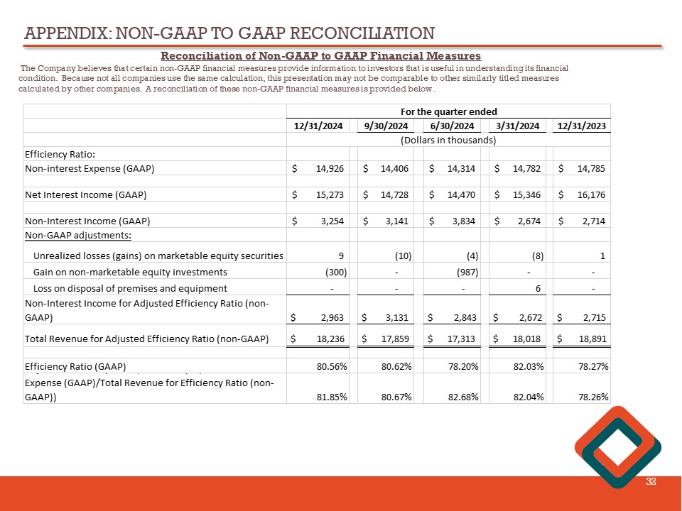 APPENDIX: NON - GAAP TO GAAP RECONCILIATION 31 Reconciliation of Non - GAAP to GAAP Financial Measures The Company believes that certain non - GAAP financial measures provide information to investors that is useful in understanding i ts financial condition. Because not all companies use the same calculation, this presentation may not be comparable to other similarly title d measures calculated by other companies. A reconciliation of these non - GAAP financial measures is provided below. 12/31/2024 9/30/2024 6/30/2024 3/31/2024 12/31/2023 Book Value per Share (GAAP) 11.30$ 11.40$ 11.07$ 10.90$ 10.96$ Non-GAAP adjustments: Goodwill (0.60) (0.59) (0.58) (0.58) (0.58) Core deposit intangible (0.07) (0.08) (0.08) (0.07) (0.08) Tangible Book Value per Share (non-GAAP) 10.63$ 10.73$ 10.41$ 10.25$ 10.30$ Total Bank Equity (GAAP) 240,994$ 245,786$ 241,867$ 241,480$ 242,780$ Non-GAAP adjustments: Goodwill (12,487) (12,487) (12,487) (12,487) (12,487) Core deposit intangible net of associated deferred tax (1,033) (1,101) (1,168) (1,236) (1,303) Tangible Capital (non-GAAP) 227,474$ 232,198$ 228,212$ 227,757$ 228,990$ Tangible Capital (non-GAAP) 227,474$ 232,198$ 228,212$ 227,757$ 228,990$ Unrealized losses on HTM securities net of tax (28,346) (22,083) (28,869) (28,441) (25,649) Adjusted Tangible Capital For Impact of Unrealized Losses on HTM Securities Net of Tax (non-GAAP) 199,128$ 210,115$ 199,343$ 199,316$ 203,341$ Common Equity Tier (CET) 1 Capital 250,748$ 250,543$ 251,849$ 251,394$ 250,734$ Total Assets for Leverage Ratio (non-GAAP) 2,684,740$ 2,608,171$ 2,575,093$ 2,572,525$ 2,607,260$ Tier 1 Leverage Ratio 9.34% 9.61% 9.78% 9.77% 9.62% Tangible Common Equity (non-GAAP) =Tangible Capital (non-GAAP)/Total Assets for Leverage Ratio (non-GAAP) 8.47% 8.90% 8.86% 8.85% 8.78% Adjusted Tangible Common Equity for HTM Impact (non- GAAP) = Adjusted Tangible Capital For Impact of Unrealized Losses on HTM Securities Net of Tax (non-GAAP)/Total Assets for Leverage Ratio (non-GAAP) 7.42% 8.06% 7.74% 7.75% 7.80% For the quarter ended (Dollars in thousands)