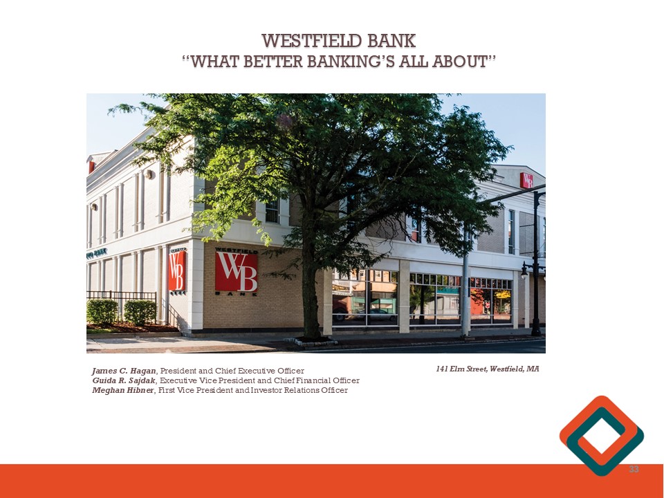 WESTFIELD BANK “WHAT BETTER BANKING’S ALL ABOUT” James C. Hagan , President and Chief Executive Officer Guida R. Sajdak , Executive Vice President and Chief Financial Officer Meghan Hibner , First Vice President and Investor Relations Officer 33 141 Elm Street, Westfield, MA