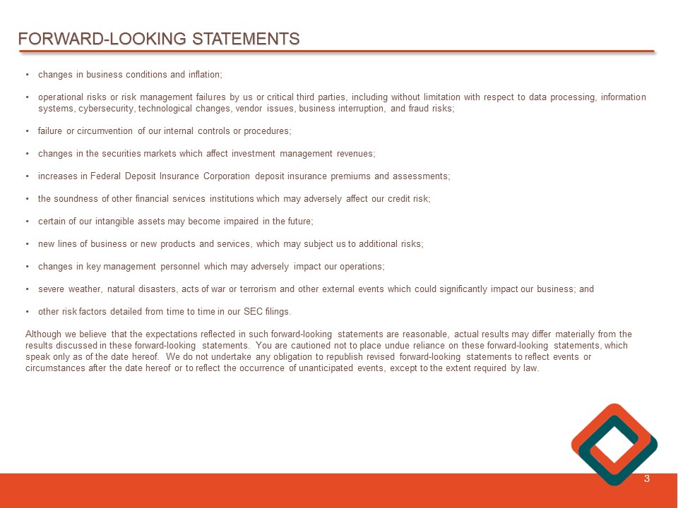 FORWARD - LOOKING STATEMENTS 2 We may, from time to time, make written or oral “forward - looking statements” within the meaning of the Private Securities Litigation Reform Act of 1995 , including statements contained in our filings with the Securities and Exchange Commission (the “SEC”), our reports to shareholders and in other communications by us . This Investor Presentation contains “forward - looking statements” with respect to the Company’s financial condition, liquidity , results of operations, future performance, and business . Forward - looking statements may be identified by the use of such words as “believe,” “expect,” “anticipate ,” “ should,” “planned,” “estimated,” and “potential . ” Examples of forward - looking statements include, but are not limited to, estimates with respect to our financial condition, results of operations and business that are subject to various factors which could cause actual results to differ materially from these estimates . These factors include, but are not limited to : • unpredictable changes in general economic conditions, financial markets, fiscal, monetary and regulatory policies, including actual or potential stress in the banking industry ; • the duration and scope of potential pandemics, including the emergence of new variants and the response thereto ; • changes in economic conditions which could materially impact credit quality trends and the ability to generate loans and gather deposits ; • inflation and governmental responses to inflation, including recent and potential future increases in interest rates that reduce margins ; • the effect on our operations of governmental legislation and regulation, including changes in accounting regulation or standards, the nature and timing of the adoption and effectiveness of new requirements under the Dodd - Frank Act Wall Street Reform and Consumer Protection Act of 2010 , Basel guidelines, capital requirements and other applicable laws and regulations ; • significant changes in accounting, tax or regulatory practices or requirements ; • new legal obligations or liabilities or unfavorable resolutions of litigation ; • disruptive technologies in payment systems and other services traditionally provided by banks ; • the highly competitive industry and market area in which we operate ;