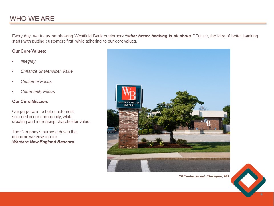 WHO WE ARE Every day, we focus on showing Westfield Bank customers “ what better banking is all about . ” For us, the idea of better banking starts with putting customers first, while adhering to our core values . Our Core Values : • Integrity • Enhance Shareholder Value • Customer Focus • Community Focus Our Core Mission : Our purpose is to help customers succeed in our community, while creating and increasing shareholder value . The Company’s purpose drives the outcome we envision for Western New England Bancorp . 4 70 Center Street, Chicopee, MA.