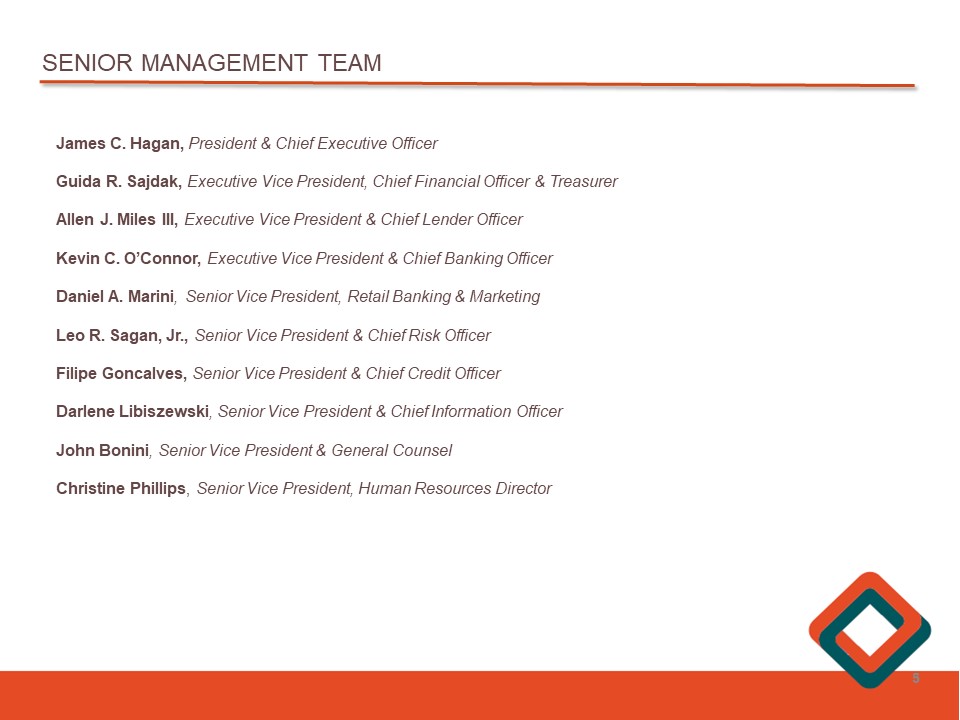 SENIOR MANAGEMENT TEAM James C . Hagan, President & Chief Executive Officer Guida R . Sajdak, Executive Vice President, Chief Financial Officer & Treasurer Allen J . Miles III, Executive Vice President & Chief Lender Officer Kevin C . O’Connor, Executive Vice President & Chief Banking Officer Daniel A . Marini , Senior Vice President, Retail Banking & Marketing Leo R . Sagan, Jr . , Senior Vice President & Chief Risk Officer Filipe Goncalves, Senior Vice President & Chief Credit Officer Darlene Libiszewski , Senior Vice President & Chief Information Officer John Bonini , Senior Vice President & General Counsel Christine Phillips , Senior Vice President, Human Resources Director 5