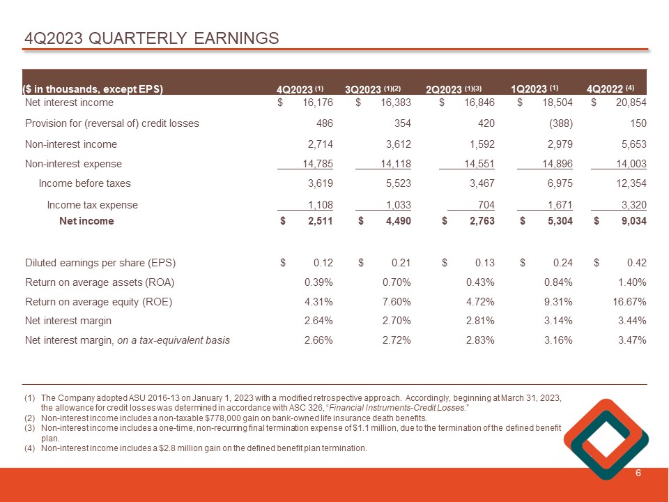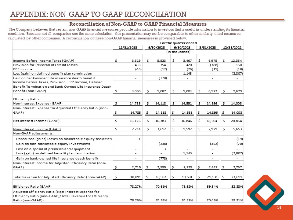 APPENDIX: NON - GAAP TO GAAP RECONCILIATION 31 Reconciliation of Non - GAAP to GAAP Financial Measures The Company believes that certain non - GAAP financial measures provide information to investors that is useful in understanding i ts financial condition. Because not all companies use the same calculation, this presentation may not be comparable to other similarly title d measures calculated by other companies. A reconciliation of these non - GAAP financial measures is provided below. 12/31/2023 9/30/2023 6/30/2023 3/31/2023 12/31/2022 Income Before Income Taxes (GAAP) 3,619$ 5,523$ 3,467$ 6,975$ 12,354$ Provision for (reversal of) credit losses 486 354 420 (388) 150 PPP Income (46) (12) (26) (15) (18) Loss (gain) on defined benefit plan termination - - 1,143 - (2,807) Gain on bank-owned life insurance death benefit - (778) - - - Income Before Taxes, Provision, PPP Income, Defined Benefit Termination and Bank-Owned Life Insurance Death Benefit (non-GAAP) 4,059$ 5,087$ 5,004$ 6,572$ 9,679$ Efficiency Ratio: Non-interest Expense (GAAP) 14,785$ 14,118$ 14,551$ 14,896$ 14,003$ Non-Interest Expense for Adjusted Efficiency Ratio (non- GAAP) $ 14,785 $ 14,118 $ 14,551 $ 14,896 $ 14,003 Net Interest Income (GAAP) 16,176$ 16,383$ 16,846$ 18,504$ 20,854$ Non-Interest Income (GAAP) 2,714$ 3,612$ 1,592$ 2,979$ 5,653$ Non-GAAP adjustments: Unrealized (gains) losses on marketable equity securities 1 - - - (19) Gain on non-marketable equity investments - (238) - (352) (70) Loss on disposal of premises and equipment - 3 - - - Loss (gain) on defined benefit plan termination - - 1,143 - (2,807) Gain on bank-owned life insurance death benefit - (778) - - - Non-Interest Income for Adjusted Efficiency Ratio (non- GAAP) $ 2,715 $ 2,599 $ 2,735 $ 2,627 $ 2,757 Total Revenue for Adjusted Efficiency Ratio (non-GAAP) $ 18,891 $ 18,982 $ 19,581 $ 21,131 $ 23,611 Efficiency Ratio (GAAP) 78.27% 70.61% 78.92% 69.34% 52.83% Adjusted Efficiency Ratio (Non-interest Expense for Efficiency Ratio (non-GAAP)/Total Revenue for Efficiency Ratio (non-GAAP)) 78.26% 74.38% 74.31% 70.49% 59.31% For the quarter ended (In thousands)