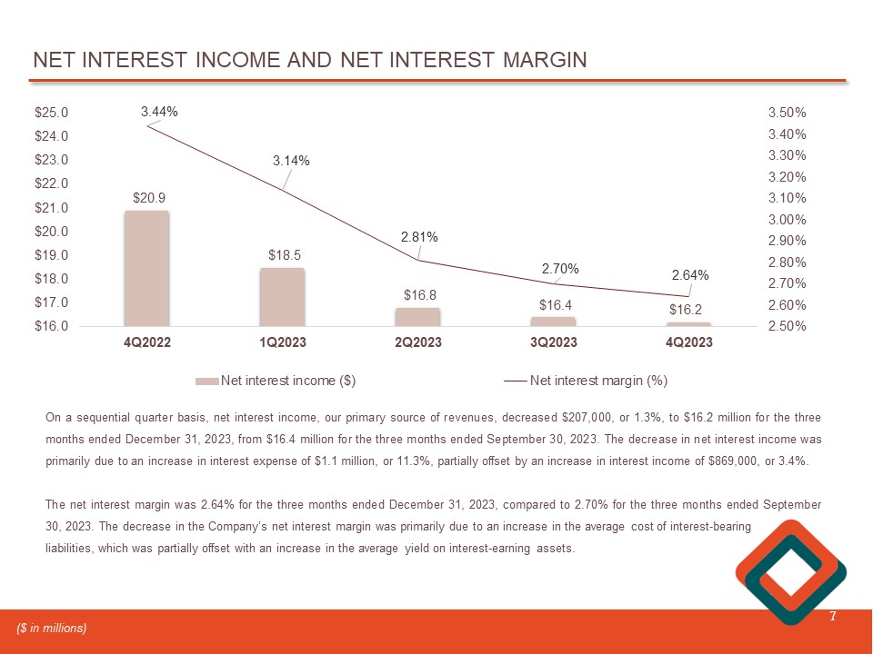 4 Q2023 QUARTERLY EARNINGS 6 4Q2022 (4) 1Q2023 (1) 2Q2023 (1)(3) 3Q2023 (1)(2) 4Q2023 (1) ($ in thousands , except EPS) $ 20,854 $ 18,504 $ 16,846 $ 16,383 $ 16,176 Net interest income 150 (388) 420 354 486 Provision for (reversal of) credit losses 5,653 2,979 1,592 3,612 2,714 Non - interest income 14,003 14,896 14,551 14,118 14,785 Non - interest expense 12,354 6,975 3,467 5,523 3,619 Income before taxes 3,320 1,671 704 1,033 1,108 Income tax expense $ 9,034 $ 5,304 $ 2,763 $ 4,490 $ 2,511 Net income $ 0.42 $ 0.24 $ 0.13 $ 0.21 $ 0.12 Diluted earnings per share (EPS) 1.40% 0.84% 0.43% 0.70% 0.39% Return on average assets (ROA) 16.67% 9.31% 4.72% 7.60% 4.31% Return on average equity (ROE) 3.44% 3.14% 2.81% 2.70% 2.64% Net interest margin 3.47% 3.16% 2.83% 2.72% 2.66% Net interest margin, on a tax - equivalent basis (1) The Company adopted ASU 2016 - 13 on January 1, 2023 with a modified retrospective approach. Accordingly, beginning at March 31, 2023, the allowance for credit losses was determined in accordance with ASC 326, “ Financial Instruments - Credit Losses .” (2) Non - interest income includes a non - taxable $778,000 gain on bank - owned life insurance death benefits. (3) Non - interest income includes a one - time, non - recurring final termination expense of $1.1 million, due to the termination of the defined benefit plan. (4) Non - interest income includes a $2.8 million gain on the defined benefit plan termination.