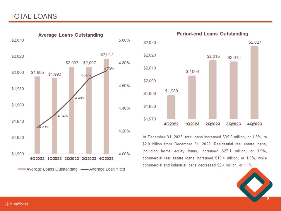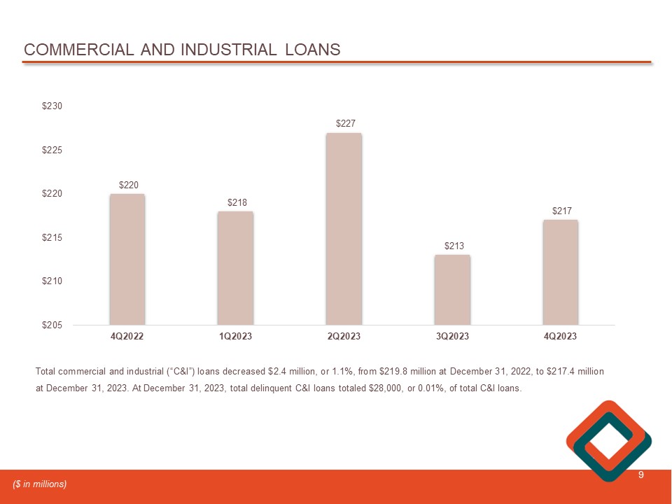 TOTAL LOANS 8 $1,995 $1,993 $2,007 $2,007 $2,017 4.23% 4.34% 4.49% 4.66% 4.73% 4.00% 4.20% 4.40% 4.60% 4.80% 5.00% 4Q2022 1Q2023 2Q2023 3Q2023 4Q2023 $1,900 $1,920 $1,940 $1,960 $1,980 $2,000 $2,020 $2,040 Average Loans Outstanding Average Loans Outstanding Average Loan Yield $1,989 $2,004 $2,016 $2,015 $2,027 4Q2022 1Q2023 2Q2023 3Q2023 4Q2023 $1,970 $1,980 $1,990 $2,000 $2,010 $2,020 $2,030 Period - end Loans Outstanding At December 31 , 2023 , total loans increased $ 35 . 9 million , or 1 . 8 % , to $ 2 . 0 billion from December 31 , 2022 . R esidential real estate loans, including home equity loans, increased $ 27 . 1 million, or 3 . 9 % , commercial real estate loans increased $ 10 . 4 million, or 1 . 0 % , while commercial and industrial loans decreased $ 2 . 4 million , or 1 . 1 % . ($ in millions)