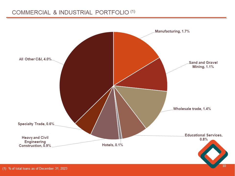 COMMERCIAL AND INDUSTRIAL LOANS 9 $220 $218 $227 $213 $217 4Q2022 1Q2023 2Q2023 3Q2023 4Q2023 $205 $210 $215 $220 $225 $230 Total commercial and industrial (“C&I”) loans decreased $ 2 . 4 million, or 1 . 1 % , from $ 219 . 8 million at December 31 , 2022 , to $ 217 . 4 million at December 31 , 2023 . At December 31 , 2023 , total delinquent C&I loans totaled $ 28 , 000 , or 0 . 01 % , of total C&I loans . ($ in millions)