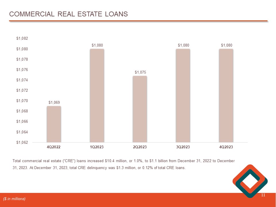 COMMERCIAL REAL ESTATE LOANS 11 $1,069 $1,080 $1,075 $1,080 $1,080 4Q2022 1Q2023 2Q2023 3Q2023 4Q2023 $1,062 $1,064 $1,066 $1,068 $1,070 $1,072 $1,074 $1,076 $1,078 $1,080 $1,082 Total commercial real estate (“CRE”) loans increased $ 10 . 4 million, or 1 . 0 % , to $ 1 . 1 billion from December 31 , 2022 to December 31 , 2023 . At December 31 , 2023 , total CRE delinquency was $ 1 . 3 million, or 0 . 12 % of total CRE loans . ($ in millions)