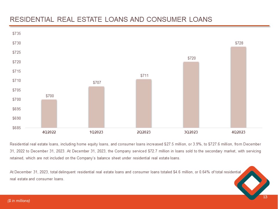 RESIDENTIAL REAL ESTATE LOANS AND CONSUMER LOANS 13 $700 $707 $711 $720 $728 4Q2022 1Q2023 2Q2023 3Q2023 4Q2023 $685 $690 $695 $700 $705 $710 $715 $720 $725 $730 $735 Residential real estate loans , including home equity loans, and consumer loans increased $ 27 . 5 million , or 3 . 9 % , to $ 727 . 6 million, from December 31 , 2022 to December 31 , 2023 . At December 31 , 2023 , the Company serviced $ 72 . 7 million in loans sold to the secondary market, with servicing retained, which are not included on the Company’s balance sheet under residential real estate loans . At December 31 , 2023 , total delinquent residential real estate loans and consumer loans totaled $ 4 . 6 million, or 0 . 64 % of total residential real estate and consumer loans . ($ in millions)