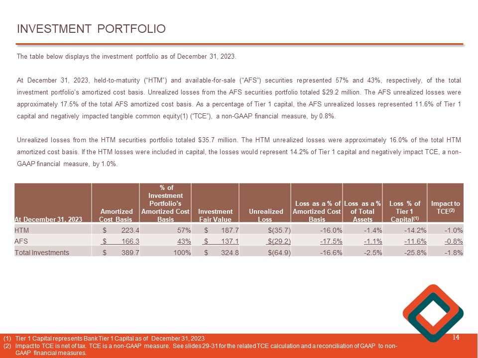 INVESTMENT PORTFOLIO 14 The table below displays the investment portfolio as of December 31 , 2023 . At December 31 , 2023 , held - to - maturity (“HTM”) and available - for - sale (“AFS”) securities represented 57 % and 43 % , respectively, of the total investment portfolio’s amortized cost basis . Unrealized losses from the AFS securities portfolio totaled $ 29 . 2 million . The AFS unrealized losses were approximately 17 . 5 % of the total AFS amortized cost basis . As a percentage of Tier 1 capital, the AFS unrealized losses represented 11 . 6 % of Tier 1 capital and negatively impacted tangible common equity( 1 ) (“TCE”), a non - GAAP financial measure, by 0 . 8 % . Unrealized losses from the HTM securities portfolio totaled $ 35 . 7 million . The HTM unrealized losses were approximately 16 . 0 % of the total HTM amortized cost basis . If the HTM losses were included in capital, the losses would represent 14 . 2 % of Tier 1 capital and negatively impact TCE, a non - GAAP financial measure, by 1 . 0 % . Impact to TCE (2) Loss % of Tier 1 Capital (1) Loss as a % of Total Assets Loss as a % of Amortized Cost Basis Unrealized Loss Investment Fair Value % of Investment Portfolio’s Amortized Cost Basis Amortized Cost Basis At December 31, 2023 - 1.0% - 14.2% - 1.4% - 16.0% $(35.7) $ 187.7 57% $ 223.4 HTM - 0.8% - 11.6% - 1.1% - 17.5% $(29.2) $ 137.1 43% $ 166.3 AFS - 1.8% - 25.8% - 2.5% - 16.6% $(64.9) $ 324.8 100% $ 389.7 Total Investments (1) Tier 1 Capital represents Bank Tier 1 Capital as of December 31, 2023 (2) Impact to TCE is net of tax. TCE is a non - GAAP measure. See slides 29 - 31 for the related TCE calculation and a reconciliation of GAAP to non - GAAP financial measures .