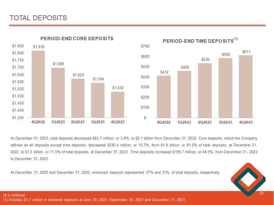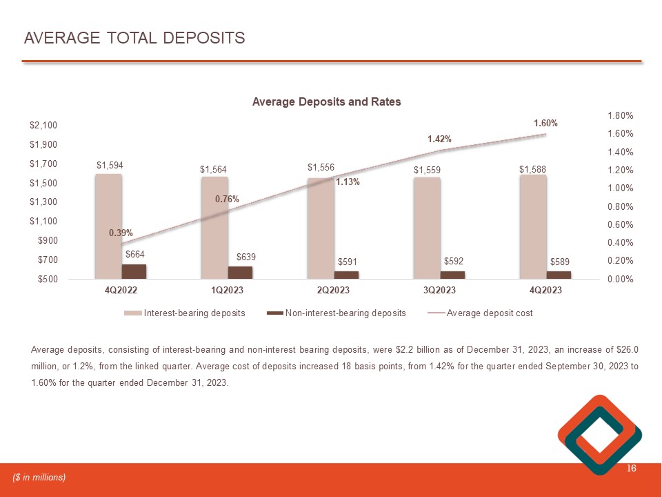 TOTAL DEPOSITS 15 $1,818 $1,699 $1,623 $1,594 $1,532 4Q2022 1Q2023 2Q2023 3Q2023 4Q2023 $1,350 $1,400 $1,450 $1,500 $1,550 $1,600 $1,650 $1,700 $1,750 $1,800 $1,850 PERIOD - END CORE DEPOSITS At December 31 , 2023 , total deposits decreased $ 85 . 7 million, or 3 . 8 % , to $ 2 . 1 billion from December 31 , 2022 . Core deposits, which the Company defines as all deposits except time deposits, decreased $ 285 . 4 million, or 15 . 7 % , from $ 1 . 8 billion, or 81 . 5 % of total deposits, at December 31 , 2022 , to $ 1 . 5 billion, or 71 . 5 % of total deposits, at December 31 , 2023 . Time deposits increased $ 199 . 7 million, or 48 . 5 % , from December 31 , 2022 to December 31 , 2023 . At December 31 , 2023 and December 31 , 2022 , uninsured deposits represented 27 % and 31 % , of total deposits, respectively . $412 $458 $535 $583 $611 4Q2022 1Q2023 2Q2023 3Q2023 4Q2023 $- $100 $200 $300 $400 $500 $600 $700 PERIOD - END TIME DEPOSITS ($ in millions) (1) Includes $1.7 million in brokered deposits at June 30, 2023, September 30, 2023 and December 31, 2023 (1)