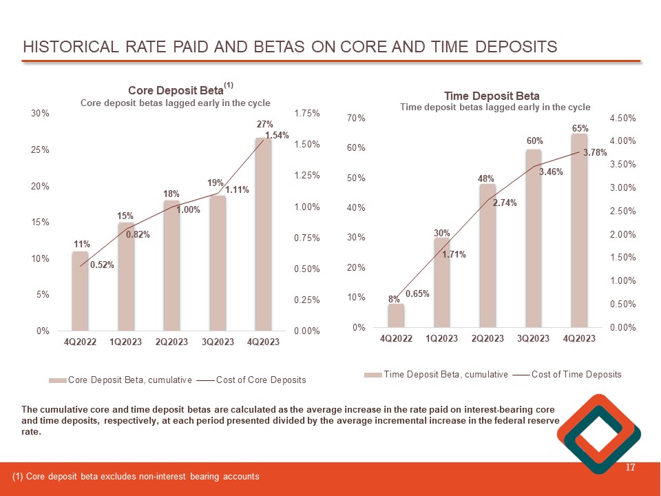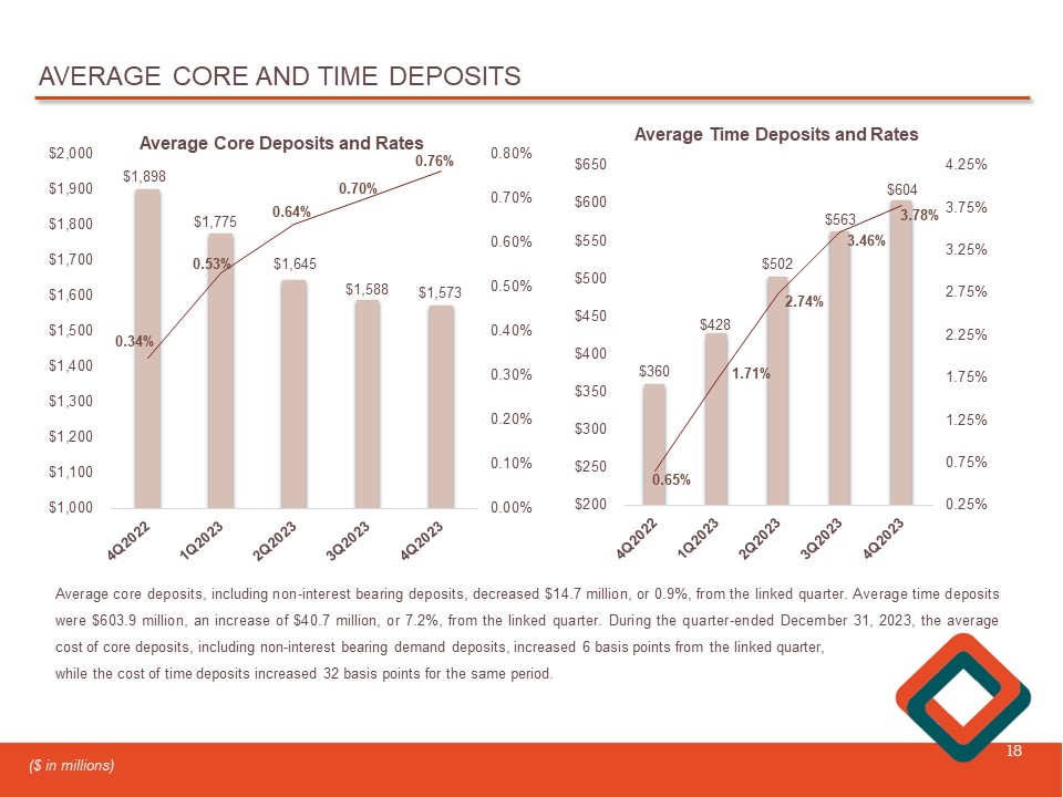 HISTORICAL RATE PAID AND BETAS ON CORE AND TIME DEPOSITS 17 (1) Core deposit beta excludes non - interest bearing accounts 11% 15% 18% 19% 27% 0.52% 0.82% 1.00% 1.11% 1.54% 0.00% 0.25% 0.50% 0.75% 1.00% 1.25% 1.50% 1.75% 4Q2022 1Q2023 2Q2023 3Q2023 4Q2023 0% 5% 10% 15% 20% 25% 30% Core Deposit Beta Core Deposit Beta, cumulative Cost of Core Deposits (1) 8% 30% 48% 60% 65% 0.65% 1.71% 2.74% 3.46% 3.78% 0.00% 0.50% 1.00% 1.50% 2.00% 2.50% 3.00% 3.50% 4.00% 4.50% 4Q2022 1Q2023 2Q2023 3Q2023 4Q2023 0% 10% 20% 30% 40% 50% 60% 70% Time Deposit Beta Time Deposit Beta, cumulative Cost of Time Deposits Time deposit betas lagged early in the cycle The cumulative core and time deposit betas are calculated as the average increase in the rate paid on interest - bearing core and time deposits, respectively, at each period presented divided by the average incremental increase in the federal reserve rate. Core deposit betas lagged early in the cycle