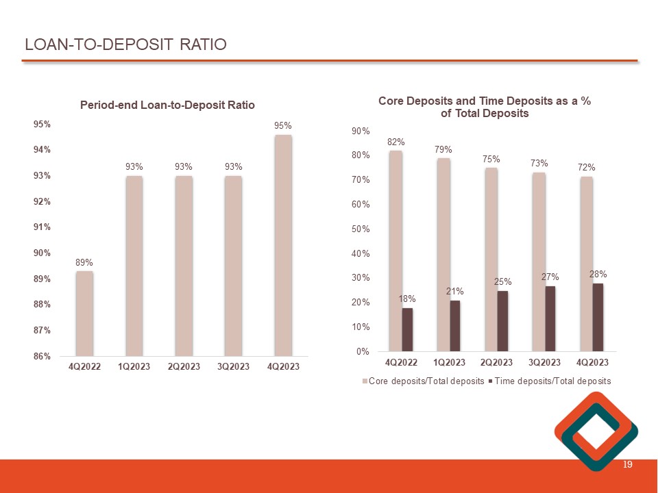 AVERAGE CORE AND TIME DEPOSITS 18 $1,898 $1,775 $1,645 $1,588 $1,573 0.34% 0.53% 0.64% 0.70% 0.76% 0.00% 0.10% 0.20% 0.30% 0.40% 0.50% 0.60% 0.70% 0.80% $1,000 $1,100 $1,200 $1,300 $1,400 $1,500 $1,600 $1,700 $1,800 $1,900 $2,000 Average Core Deposits and Rates Average core deposits, including non - interest bearing deposits, decreased $ 14 . 7 million, or 0 . 9 % , from the linked quarter . Average time deposits were $ 603 . 9 million, an increase of $ 40 . 7 million, or 7 . 2 % , from the linked quarter . During the quarter - ended December 31 , 2023 , the average cost of core deposits, including non - interest bearing demand deposits, increased 6 basis points from the linked quarter, while the cost of time deposits increased 32 basis points for the same period . ($ in millions) $360 $428 $502 $563 $604 0.65% 1.71% 2.74% 3.46% 3.78% 0.25% 0.75% 1.25% 1.75% 2.25% 2.75% 3.25% 3.75% 4.25% $200 $250 $300 $350 $400 $450 $500 $550 $600 $650 Average Time Deposits and Rates