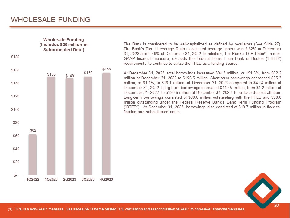 WHOLESALE FUNDING 20 $62 $150 $148 $150 $156 4Q2022 1Q2023 2Q2023 3Q2023 4Q2023 $- $20 $40 $60 $80 $100 $120 $140 $160 $180 Wholesale Funding (Includes $20 million in Subordinated Debt) The Bank is considered to be well - capitalized as defined by regulators (See Slide 27 ) . The Bank’s Tier 1 Leverage Ratio to adjusted average assets was 9 . 62 % at December 31 , 2023 and 9 . 49 % at December 31 , 2022 . In addition , The Bank’s TCE Ratio ( 1 ) , a non - GAAP financial measure, exceeds the Federal Home Loan Bank of Boston (“FHLB”) requirements to continue to utilize the FHLB as a funding source . At December 31 , 2023 , total borrowings increased $ 94 . 3 million, or 151 . 5 % , from $ 62 . 2 million at December 31 , 2022 to $ 156 . 5 million . Short - term borrowings decreased $ 25 . 3 million, or 61 . 1 % , to $ 16 . 1 million , at December 31 , 2023 compared to $ 41 . 4 million at December 31 , 2022 . Long - term borrowings increased $ 119 . 5 million, from $ 1 . 2 million at December 31 , 2022 , to $ 120 . 6 million at December 31 , 2023 , to replace deposit attrition . Long - term borrowings consisted of $ 30 . 6 million outstanding with the FHLB and $ 90 . 0 million outstanding under the Federal Reserve Bank’s Bank Term Funding Program (“BTFP”) . At December 31 , 2023 , borrowings also consisted of $ 19 . 7 million in fixed - to - floating rate subordinated notes . (1) TCE is a non - GAAP measure. See slides 29 - 31 for the related TCE calculation and a reconciliation of GAAP to non - GAAP financial measures .