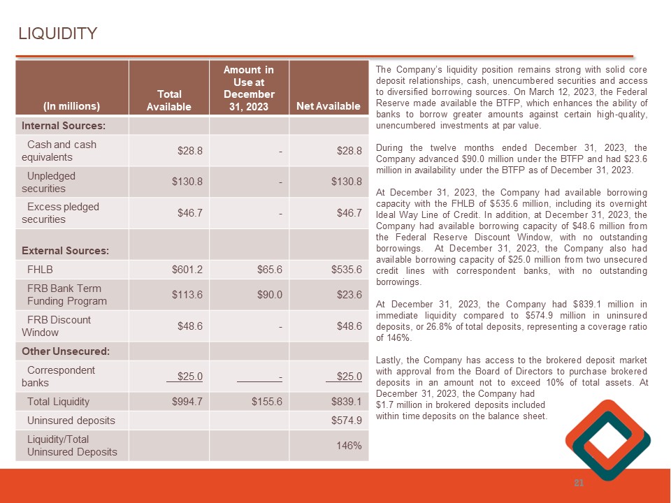 21 Net Available Amount in Use at December 31, 2023 Total Available (In millions) Internal Sources: $28.8 - $28.8 Cash and cash equivalents $130.8 - $130.8 Unpledged securities $46.7 - $46.7 Excess pledged securities External Sources: $535.6 $65.6 $601.2 FHLB $23.6 $90.0 $113.6 FRB Bank Term Funding Program $48.6 - $48.6 FRB Discount Window Other Unsecured: $25.0 - $25.0 Correspondent banks $839.1 $155.6 $994.7 Total Liquidity $574.9 Uninsured deposits 146% Liquidity/Total Uninsured Deposits The Company’s liquidity position remains strong with solid core deposit relationships, cash, unencumbered securities and access to diversified borrowing sources . On March 12 , 2023 , the Federal Reserve made available the BTFP, which enhances the ability of banks to borrow greater amounts against certain high - quality, unencumbered investments at par value . During the twelve months ended December 31 , 2023 , the Company advanced $ 90 . 0 million under the BTFP and had $ 23 . 6 million in availability under the BTFP as of December 31 , 2023 . At December 31 , 2023 , the Company had available borrowing capacity with the FHLB of $ 535 . 6 million, including its overnight Ideal Way Line of Credit . In addition, at December 31 , 2023 , the Company had available borrowing capacity of $ 48 . 6 million from the Federal Reserve Discount Window, with no outstanding borrowings . At December 31 , 2023 , the Company also had available borrowing capacity of $ 25 . 0 million from two unsecured credit lines with correspondent banks, with no outstanding borrowings . At December 31 , 2023 , the Company had $ 839 . 1 million in immediate liquidity compared to $ 574 . 9 million in uninsured deposits, or 26 . 8 % of total deposits, representing a coverage ratio of 146 % . Lastly, the Company has access to the brokered deposit market with approval from the Board of Directors to purchase brokered deposits in an amount not to exceed 10 % of total assets . At December 31 , 2023 , the Company had $ 1 . 7 million in brokered deposits included within time deposits on the balance sheet . LIQUIDITY