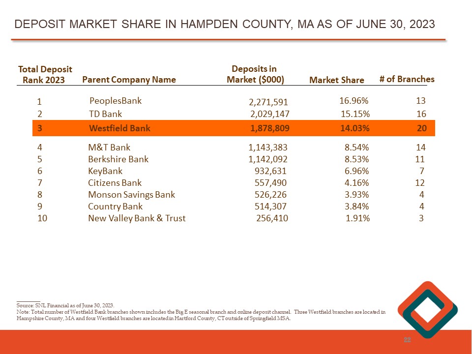 ________ Source: SNL Financial as of June 30, 2023. Note: Total number of Westfield Bank branches shown includes the Big E seasonal branch and online deposit channel. Three Wes tfi eld branches are located in Hampshire County, MA and four Westfield branches are located in Hartford County, CT outside of Springfield MSA. DEPOSIT MARKET SHARE IN HAMPDEN COUNTY, MA AS OF JUNE 30, 2023 22 Total Deposit Rank 2023 Parent Company Name Deposits in Market ($000) Market Share # of Branches 1 PeoplesBank 2,271,591 16.96% 13 1,762,519 13.1% 20 3 Westfield Bank 1,878,809 14.03% 20 2 TD Bank 2,029,147 15.15 % 16 4 M&T Bank 1,143,383 8.54% 14 5 Berkshire Bank 1,142,092 8.53% 11 6 KeyBank 932,631 6.96% 7 7 Citizens Bank 557,490 4.16% 12 8 Monson Savings Bank 526,226 3.93% 4 9 Country Bank 514,307 3.84% 4 10 New Valley Bank & Trust 256,410 1.91% 3