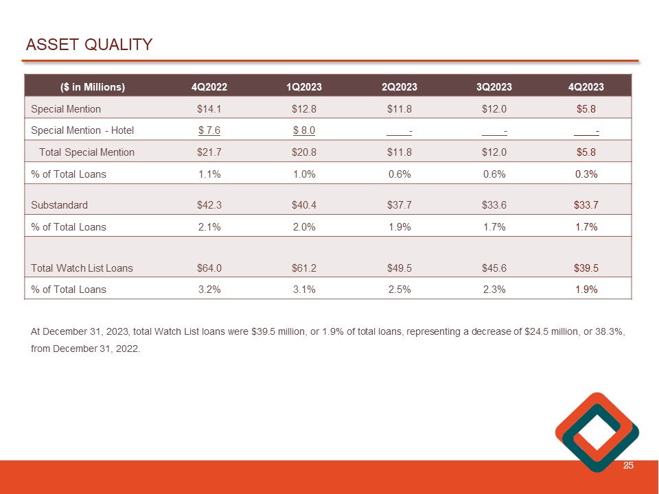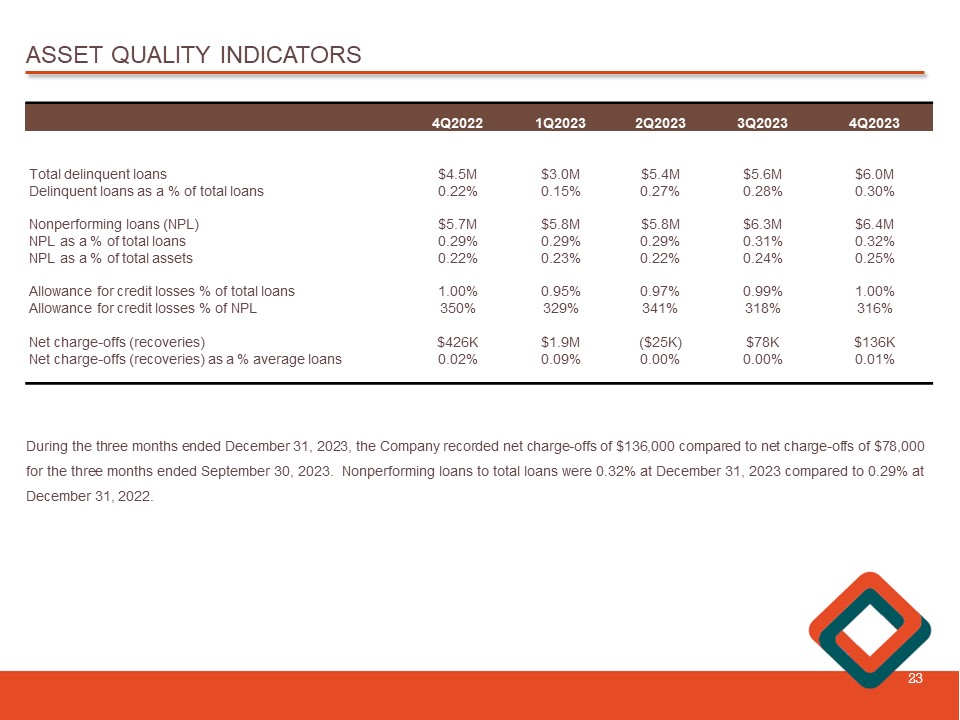 ASSET QUALITY INDICATORS 23 4Q2023 3Q2023 2Q2023 1Q2023 4Q2022 $6.0M $5.6M $5.4M $3.0M $4.5M Total delinquent loans 0.30% 0.28% 0.27% 0.15% 0.22% Delinquent loans as a % of total loans $6.4M $6.3M $5.8M $5.8M $5.7M Nonperforming loans (NPL) 0.32% 0.31% 0.29% 0.29% 0.29% NPL as a % of total loans 0.25% 0.24% 0.22% 0.23% 0.22% NPL as a % of total assets 1.00% 0.99% 0.97% 0.95% 1.00% Allowance for credit losses % of total loans 316% 318% 341% 329% 350% Allowance for credit losses % of NPL $136K $78K ($25K) $1.9M $426K Net charge - offs (recoveries) 0.01% 0.00% 0.00% 0.09% 0.02% Net charge - offs (recoveries) as a % average loans During the three months ended December 31 , 2023 , the Company recorded net charge - offs of $ 136 , 000 compared to net charge - offs of $ 78 , 000 for the three months ended September 30 , 2023 . Nonperforming loans to total loans were 0 . 32 % at December 31 , 2023 compared to 0 . 29 % at December 31 , 2022 .