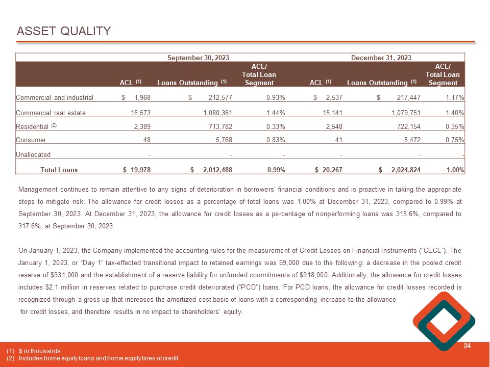 ASSET QUALITY 24 Management continues to remain attentive to any signs of deterioration in borrowers’ financial conditions and is proactive in taking the appropriate steps to mitigate risk . The allowance for credit losses as a percentage of total loans was 1 . 00 % at December 31 , 2023 , compared to 0 . 99 % at September 30 , 2023 . At December 31 , 2023 , the allowance for credit losses as a percentage of nonperforming loans was 315 . 6 % , compared to 317 . 6 % , at September 30 , 2023 . On January 1 , 2023 , the Company implemented the accounting rules for the measurement of Credit Losses on Financial Instruments (“CECL”) . The January 1 , 2023 , or “Day 1 ” tax - effected transitional impact to retained earnings was $ 9 , 000 due to the following : a decrease in the pooled credit reserve of $ 931 , 000 and the establishment of a reserve liability for unfunded commitments of $ 918 , 000 . Additionally, the allowance for credit losses includes $ 2 . 1 million in reserves related to purchase credit deteriorated (“PCD”) loans . For PCD loans, the allowance for credit losses recorded is recognized through a gross - up that increases the amortized cost basis of loans with a corresponding increase to the allowance for credit losses, and therefore results in no impact to shareholders' equity . December 31, 2023 September 30, 2023 ACL / Total Loan Segment Loans Outstanding (1) ACL (1) ACL / Total Loan Segment Loans Outstanding (1) ACL (1) 1.17% $ 217,447 $ 2,537 0.93% $ 212,577 $ 1,968 Commercial and industrial 1.40% 1,079,751 15,141 1.44% 1,080,361 15,573 Commercial real estate 0.35% 722,154 2,548 0.33% 713,782 2,389 Residential (2) 0.75% 5,472 41 0.83% 5,768 48 Consumer - - - - - - Unallocated 1.00% $ 2,024,824 $ 20,267 0.99% $ 2,012,488 $ 19,978 Total Loans (1) $ in thousands (2) Includes home equity loans and home equity lines of credit