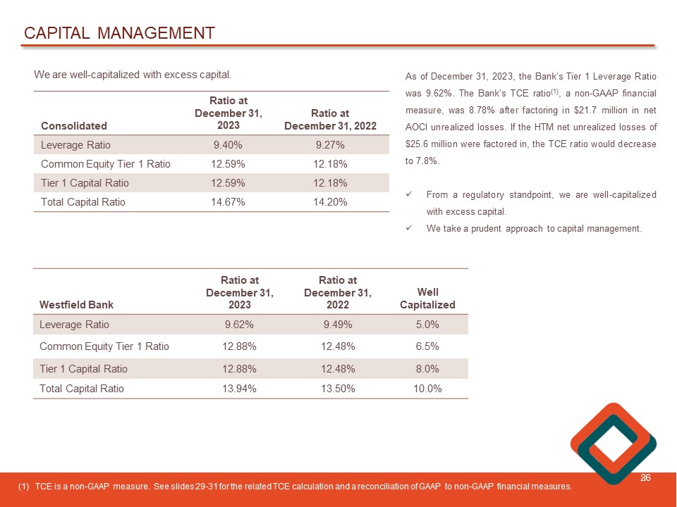 CAPITAL MANAGEMENT 26 We are well - capitalized with excess capital. Ratio at December 31, 2022 Ratio at December 31, 2023 Consolidated 9.27% 9.40% Leverage Ratio 12.18% 12.59% Common Equity Tier 1 Ratio 12.18% 12.59% Tier 1 Capital Ratio 14.20% 14.67% Total Capital Ratio As of December 31 , 2023 , the Bank’s Tier 1 Leverage Ratio was 9 . 62 % . The Bank’s TCE ratio ( 1 ) , a non - GAAP financial measure, was 8 . 78 % after factoring in $ 21 . 7 million in net AOCI unrealized losses . If the HTM net unrealized losses of $ 25 . 6 million were factored in, the TCE ratio would decrease to 7 . 8 % . x From a regulatory standpoint, we are well - capitalized with excess capital . x We take a prudent approach to capital management . Well Capitalized Ratio at December 31, 2022 Ratio at December 31, 2023 Westfield Bank 5.0% 9.49% 9.62% Leverage Ratio 6.5% 12.48% 12.88% Common Equity Tier 1 Ratio 8.0% 12.48% 12.88% Tier 1 Capital Ratio 10.0% 13.50% 13.94% Total Capital Ratio (1) TCE is a non - GAAP measure. See slides 29 - 31 for the related TCE calculation and a reconciliation of GAAP to non - GAAP financial measures .