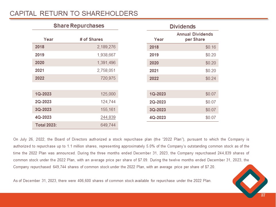 CAPITAL RETURN TO SHAREHOLDERS 27 # of Shares Year 2,189,276 2018 1,938,667 2019 1,391,496 2020 2,758,051 2021 720,975 2022 125,000 1Q - 2023 124,744 2Q - 2023 155,161 3Q - 2023 244,839 4Q - 2023 649,744 Total 2023: Annual Dividends per Share Year $0.16 2018 $0.20 2019 $0.20 2020 $0.20 2021 $0.24 2022 $0.07 1Q - 2023 $0.07 2Q - 2023 $0.07 3Q - 2023 $0.07 4Q - 2023 Share Repurchases Dividends On July 26 , 2022 , the Board of Directors authorized a stock repurchase plan (the “ 2022 Plan ”), pursuant to which the Company is authorized to repurchase up to 1 . 1 million shares, representing approximately 5 . 0 % of the Company’s outstanding common stock as of the time the 2022 Plan was announced . During the three months ended December 31 , 2023 , the Company repurchased 244 , 839 shares of common stock under the 2022 Plan, with an average price per share of $ 7 . 09 . During the twelve months ended December 31 , 2023 , the Company repurchased 649 , 744 shares of common stock under the 2022 Plan, with an average price per share of $ 7 . 20 . As of December 31 , 2023 , there were 406 , 600 shares of common stock available for repurchase under the 2022 Plan .