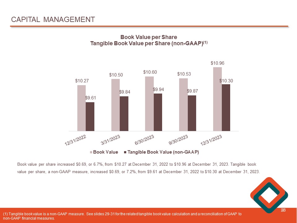 CAPITAL MANAGEMENT 28 $10.27 $10.50 $10.60 $10.53 $10.96 $9.61 $9.84 $9.94 $9.87 $10.30 Book Value per Share Tangible Book Value per Share (non - GAAP) (1) Book Value Tangible Book Value (non-GAAP) Book value per share increased $0.69, or 6.7%, from $10.27 at December 31, 2022 to $10.96 at December 31, 2023. Tangible book value per share, a non - GAAP measure, increased $0.69, or 7.2%, from $9.61 at December 31, 2022 to $10.30 at December 31, 2023. ( 1) Tangible book value is a non - GAAP measure. See slides 29 - 31 for the related tangible book value calculation and a reconcilia tion of GAAP to non - GAAP financial measures.