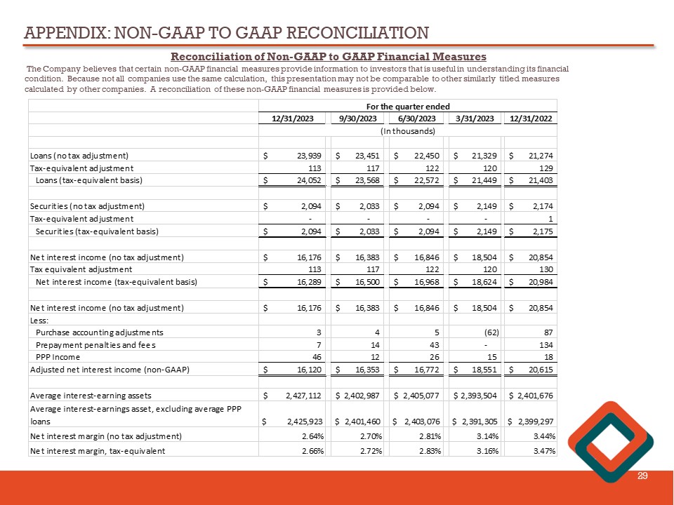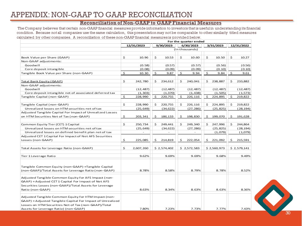 APPENDIX: NON - GAAP TO GAAP RECONCILIATION 29 Reconciliation of Non - GAAP to GAAP Financial Measures The Company believes that certain non - GAAP financial measures provide information to investors that is useful in understanding i ts financial condition. Because not all companies use the same calculation, this presentation may not be comparable to other similarly title d measures calculated by other companies. A reconciliation of these non - GAAP financial measures is provided below. 12/31/2023 9/30/2023 6/30/2023 3/31/2023 12/31/2022 Loans (no tax adjustment) 23,939$ 23,451$ 22,450$ 21,329$ 21,274$ Tax-equivalent adjustment 113 117 122 120 129 Loans (tax-equivalent basis) 24,052$ 23,568$ 22,572$ 21,449$ 21,403$ Securities (no tax adjustment) 2,094$ 2,033$ 2,094$ 2,149$ 2,174$ Tax-equivalent adjustment - - - - 1 Securities (tax-equivalent basis) 2,094$ 2,033$ 2,094$ 2,149$ 2,175$ Net interest income (no tax adjustment) 16,176$ 16,383$ 16,846$ 18,504$ 20,854$ Tax equivalent adjustment 113 117 122 120 130 Net interest income (tax-equivalent basis) 16,289$ 16,500$ 16,968$ 18,624$ 20,984$ Net interest income (no tax adjustment) 16,176$ 16,383$ 16,846$ 18,504$ 20,854$ Less: Purchase accounting adjustments 3 4 5 (62) 87 Prepayment penalties and fees 7 14 43 - 134 PPP Income 46 12 26 15 18 Adjusted net interest income (non-GAAP) 16,120$ 16,353$ 16,772$ 18,551$ 20,615$ Average interest-earning assets 2,427,112$ 2,402,987$ 2,405,077$ 2,393,504$ 2,401,676$ Average interest-earnings asset, excluding average PPP loans $ 2,425,923 $ 2,401,460 $ 2,403,076 $ 2,391,305 $ 2,399,297 Net interest margin (no tax adjustment) 2.64% 2.70% 2.81% 3.14% 3.44% Net interest margin, tax-equivalent 2.66% 2.72% 2.83% 3.16% 3.47% For the quarter ended (In thousands)