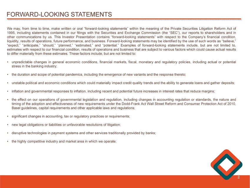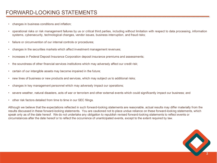 FORWARD - LOOKING STATEMENTS 2 We may, from time to time, make written or oral “forward - looking statements” within the meaning of the Private Securities Litigation Reform Act of 1995 , including statements contained in our filings with the Securities and Exchange Commission (the “SEC”), our reports to shareholders and in other communications by us . This Investor Presentation contains “forward - looking statements” with respect to the Company’s financial condition, liquidity , results of operations, future performance, and business . Forward - looking statements may be identified by the use of such words as “believe,” “expect,” “anticipate ,” “ should,” “planned,” “estimated,” and “potential . ” Examples of forward - looking statements include, but are not limited to, estimates with respect to our financial condition, results of operations and business that are subject to various factors which could cause actual results to differ materially from these estimates . These factors include, but are not limited to : • unpredictable changes in general economic conditions, financial markets, fiscal, monetary and regulatory policies, including actual or potential stress in the banking industry ; • the duration and scope of potential pandemics, including the emergence of new variants and the response thereto ; • unstable political and economic conditions which could materially impact credit quality trends and the ability to generate loans and gather deposits ; • inflation and governmental responses to inflation, including recent and potential future increases in interest rates that reduce margins ; • the effect on our operations of governmental legislation and regulation, including changes in accounting regulation or standards, the nature and timing of the adoption and effectiveness of new requirements under the Dodd - Frank Act Wall Street Reform and Consumer Protection Act of 2010 , Basel guidelines, capital requirements and other applicable laws and regulations ; • significant changes in accounting, tax or regulatory practices or requirements ; • new legal obligations or liabilities or unfavorable resolutions of litigation ; • disruptive technologies in payment systems and other services traditionally provided by banks ; • the highly competitive industry and market area in which we operate ;
