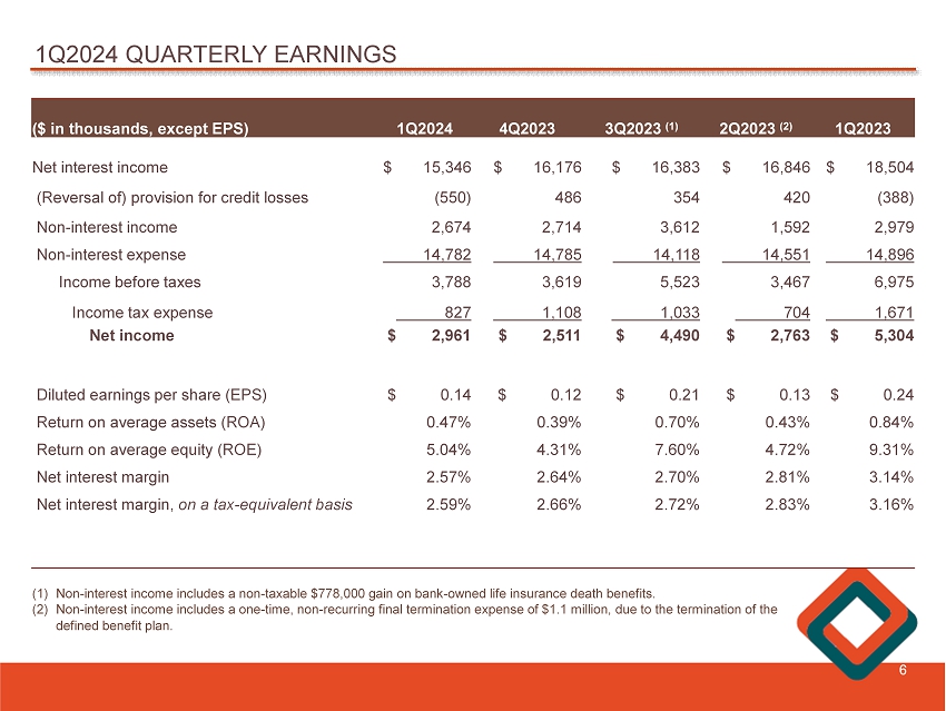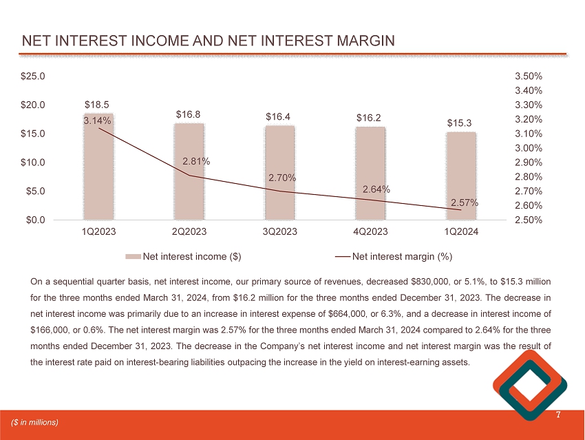 1Q2024 QUARTERLY EARNINGS 6 1Q2023 2Q2023 (2) 3Q2023 (1) 4Q2023 1Q2024 ($ in thousands , except EPS) $ 18,504 $ 16,846 $ 16,383 $ 16,176 $ 15,346 Net interest income (388) 420 354 486 (550) (R eversal of) provision for credit losses 2,979 1,592 3,612 2,714 2,674 Non - interest income 14,896 14,551 14,118 14,785 14,782 Non - interest expense 6,975 3,467 5,523 3,619 3,788 Income before taxes 1,671 704 1,033 1,108 827 Income tax expense $ 5,304 $ 2,763 $ 4,490 $ 2,511 $ 2,961 Net income $ 0.24 $ 0.13 $ 0.21 $ 0.12 $ 0.14 Diluted earnings per share (EPS) 0.84% 0.43% 0.70% 0.39% 0.47% Return on average assets (ROA) 9.31% 4.72% 7.60% 4.31% 5.04% Return on average equity (ROE) 3.14% 2.81% 2.70% 2.64% 2.57% Net interest margin 3.16% 2.83% 2.72% 2.66% 2.59% Net interest margin, on a tax - equivalent basis (1) Non - interest income includes a non - taxable $778,000 gain on bank - owned life insurance death benefits. (2) Non - interest income includes a one - time, non - recurring final termination expense of $1.1 million, due to the termination of the defined benefit plan.