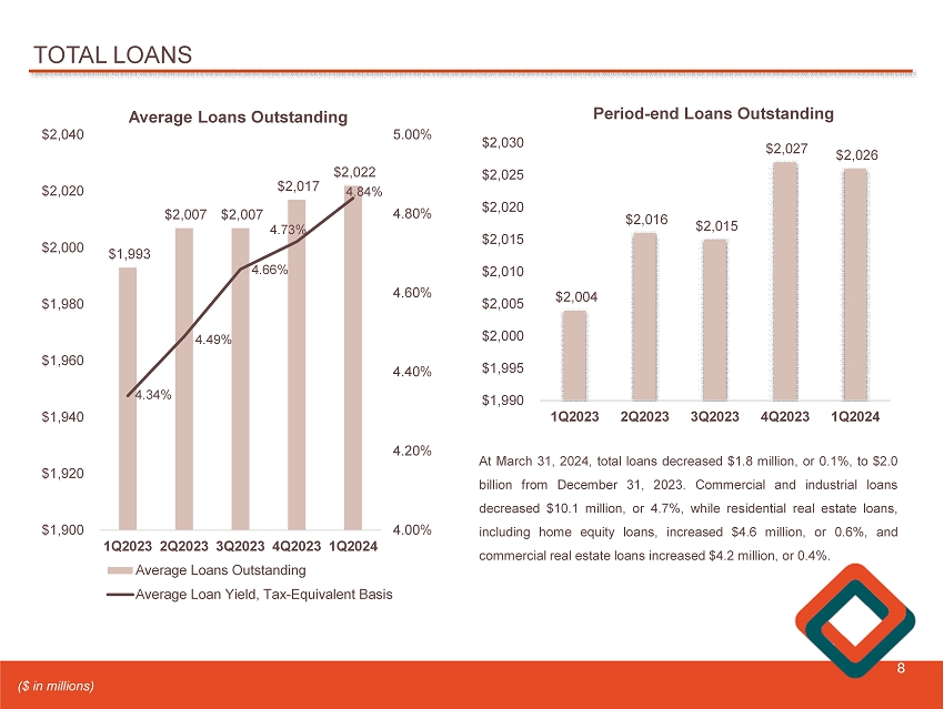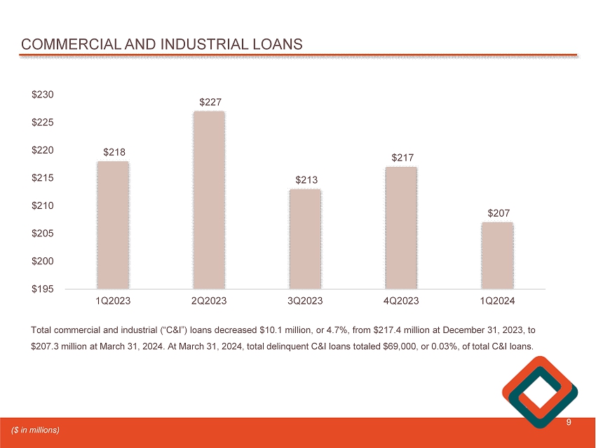 TOTAL LOANS 8 $1,993 $2,007 $2,007 $2,017 $2,022 4.34% 4.49% 4.66% 4.73% 4.84% 4.00% 4.20% 4.40% 4.60% 4.80% 5.00% 1Q2023 2Q2023 3Q2023 4Q2023 1Q2024 $1,900 $1,920 $1,940 $1,960 $1,980 $2,000 $2,020 $2,040 Average Loans Outstanding Average Loans Outstanding Average Loan Yield, Tax-Equivalent Basis $2,004 $2,016 $2,015 $2,027 $2,026 1Q2023 2Q2023 3Q2023 4Q2023 1Q2024 $1,990 $1,995 $2,000 $2,005 $2,010 $2,015 $2,020 $2,025 $2,030 Period - end Loans Outstanding At March 31 , 2024 , total loans decreased $ 1 . 8 million, or 0 . 1 % , to $ 2 . 0 billion from December 31 , 2023 . Commercial and industrial loans decreased $ 10 . 1 million, or 4 . 7 % , while residential real estate loans, including home equity loans, increased $ 4 . 6 million, or 0 . 6 % , and commercial real estate loans increased $ 4 . 2 million, or 0 . 4 % . ($ in millions)