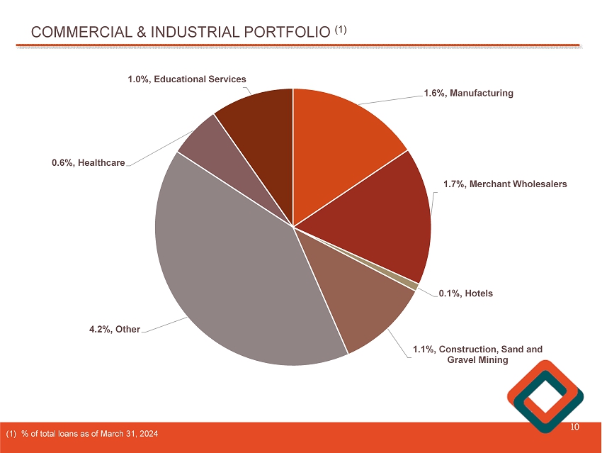 COMMERCIAL AND INDUSTRIAL LOANS 9 $218 $227 $213 $217 $207 1Q2023 2Q2023 3Q2023 4Q2023 1Q2024 $195 $200 $205 $210 $215 $220 $225 $230 Total commercial and industrial (“C&I”) loans decreased $ 10 . 1 million, or 4 . 7 % , from $ 217 . 4 million at December 31 , 2023 , to $ 207 . 3 million at March 31 , 2024 . At March 31 , 2024 , total delinquent C&I loans totaled $ 69 , 000 , or 0 . 03 % , of total C&I loans . ($ in millions)