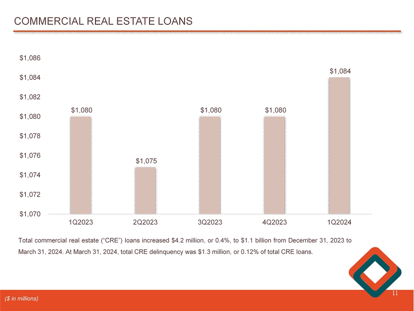 COMMERCIAL & INDUSTRIAL PORTFOLIO (1) 10 (1) % of total loans as of March 31, 2024 1.6% , Manufacturing 1.7% , Merchant Wholesalers 0.1% , Hotels 1.1% , Construction, Sand and Gravel Mining 4.2% , Other 0.6% , Healthcare 1.0% , Educational Services