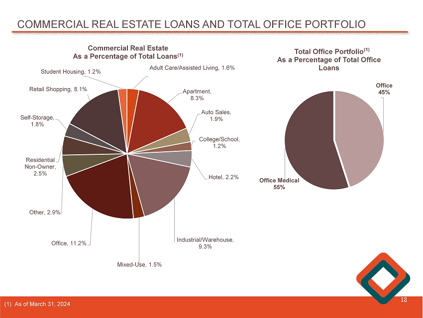 COMMERCIAL REAL ESTATE LOANS 11 $1,080 $1,075 $1,080 $1,080 $1,084 1Q2023 2Q2023 3Q2023 4Q2023 1Q2024 $1,070 $1,072 $1,074 $1,076 $1,078 $1,080 $1,082 $1,084 $1,086 Total commercial real estate (“CRE”) loans increased $ 4 . 2 million, or 0 . 4 % , to $ 1 . 1 billion from December 31 , 2023 to March 31 , 2024 . At March 31 , 2024 , total CRE delinquency was $ 1 . 3 million, or 0 . 12 % of total CRE loans . ($ in millions)