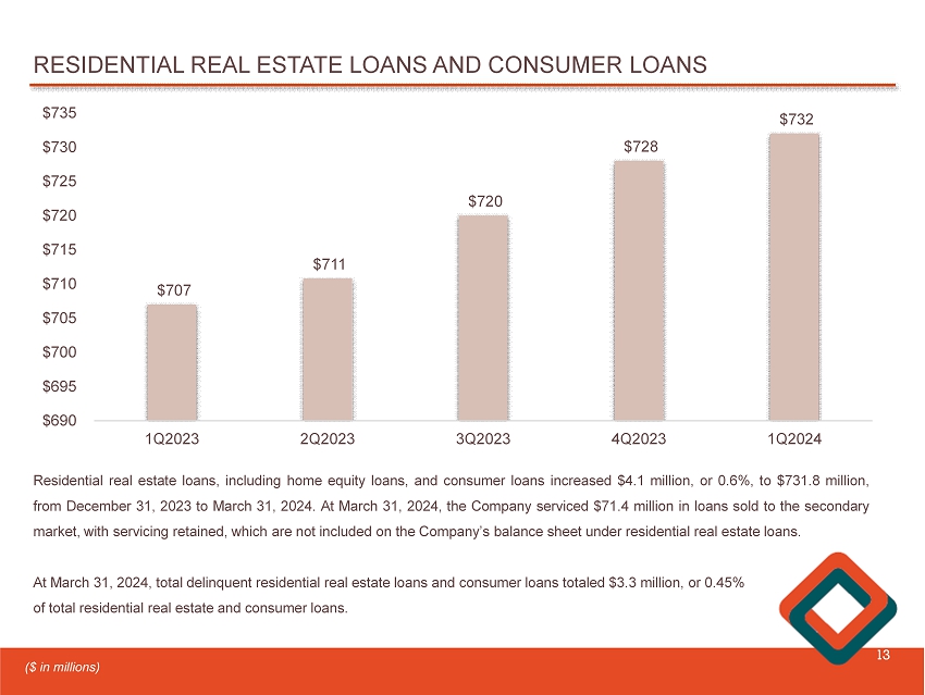COMMERCIAL REAL ESTATE LOANS AND TOTAL OFFICE PORTFOLIO 12 (1) As of March 31, 2024 Adult Care/Assisted Living, 1.6% Apartment, 8.3% Auto Sales, 1.9% College/School , 1.2% Hotel, 2.2% Industrial/Warehouse , 9.3% Mixed - Use, 1.5% Office, 11.2% Other , 2.9% Residential Non - Owner , 2.5% Self - Storage , 1.8% Retail Shopping, 8.1% Student Housing , 1.2% Commercial Real Estate As a Percentage of Total Loans (1 ) Office 45% Office Medical 55% Total Office Portfolio As a Percentage of Total Office Loans (1)