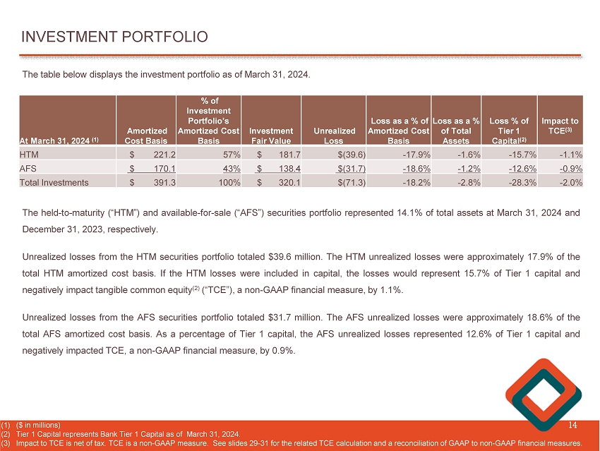 INVESTMENT PORTFOLIO 14 The held - to - maturity (“HTM”) and available - for - sale (“AFS”) securities portfolio represented 14 . 1 % of total assets at March 31 , 2024 and December 31 , 2023 , respectively . Unrealized losses from the HTM securities portfolio totaled $ 39 . 6 million . The HTM unrealized losses were approximately 17 . 9 % of the total HTM amortized cost basis . If the HTM losses were included in capital, the losses would represent 15 . 7 % of Tier 1 capital and negatively impact tangible common equity ( 2 ) (“TCE”), a non - GAAP financial measure, by 1 . 1 % . Unrealized losses from the AFS securities portfolio totaled $ 31 . 7 million . The AFS unrealized losses were approximately 18 . 6 % of the total AFS amortized cost basis . As a percentage of Tier 1 capital, the AFS unrealized losses represented 12 . 6 % of Tier 1 capital and negatively impacted TCE, a non - GAAP financial measure, by 0 . 9 % . (1) ($ in millions) (2) Tier 1 Capital represents Bank Tier 1 Capital as of March 31, 2024. (3) Impact to TCE is net of tax. TCE is a non - GAAP measure. See slides 29 - 31 for the related TCE calculation and a reconciliation of GAAP to non - GAAP financial measures . The table below displays the investment portfolio as of March 31 , 2024 . Impact to TCE (3) Loss % of Tier 1 Capital (2) Loss as a % of Total Assets Loss as a % of Amortized Cost Basis Unrealized Loss Investment Fair Value % of Investment Portfolio’s Amortized Cost Basis Amortized Cost Basis At March 31, 2024 (1) - 1.1% - 15.7% - 1.6% - 17.9% $(39.6) $ 181.7 57% $ 221.2 HTM - 0.9% - 12.6% - 1.2% - 18.6% $(31.7) $ 138.4 43% $ 170.1 AFS - 2.0% - 28.3% - 2.8% - 18.2% $(71.3) $ 320.1 100% $ 391.3 Total Investments
