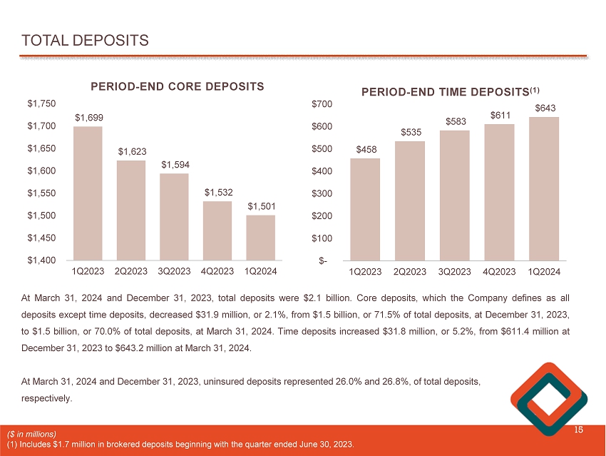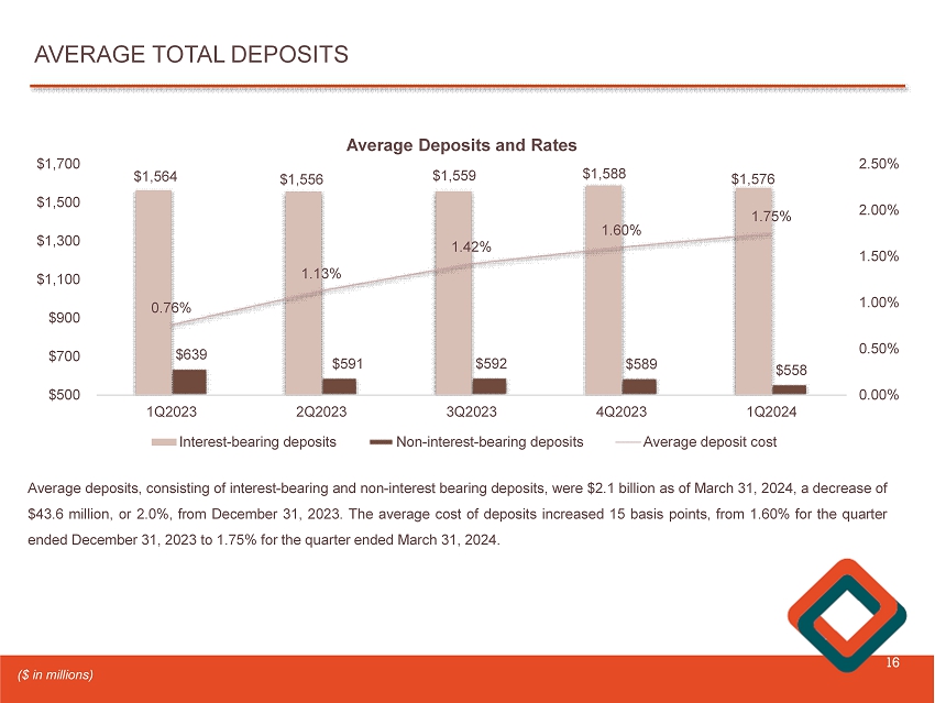 TOTAL DEPOSITS 15 $1,699 $1,623 $1,594 $1,532 $1,501 1Q2023 2Q2023 3Q2023 4Q2023 1Q2024 $1,400 $1,450 $1,500 $1,550 $1,600 $1,650 $1,700 $1,750 PERIOD - END CORE DEPOSITS At March 31 , 2024 and December 31 , 2023 , total deposits were $ 2 . 1 billion . Core deposits, which the Company defines as all deposits except time deposits, decreased $ 31 . 9 million, or 2 . 1 % , from $ 1 . 5 billion, or 71 . 5 % of total deposits, at December 31 , 2023 , to $ 1 . 5 billion, or 70 . 0 % of total deposits, at March 31 , 2024 . Time deposits increased $ 31 . 8 million, or 5 . 2 % , from $ 611 . 4 million at December 31 , 2023 to $ 643 . 2 million at March 31 , 2024 . At March 31 , 2024 and December 31 , 2023 , uninsured deposits represented 26 . 0 % and 26 . 8 % , of total deposits, respectively . $458 $535 $583 $611 $643 1Q2023 2Q2023 3Q2023 4Q2023 1Q2024 $- $100 $200 $300 $400 $500 $600 $700 PERIOD - END TIME DEPOSITS (1) ($ in millions) (1) Includes $1.7 million in brokered deposits beginning with the quarter ended June 30, 2023.