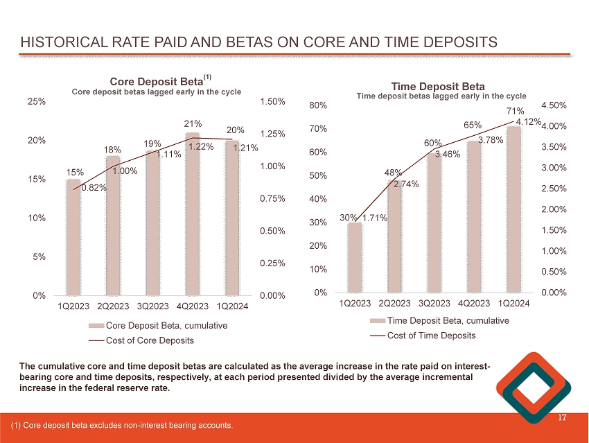 AVERAGE TOTAL DEPOSITS 16 $1,564 $1,556 $1,559 $1,588 $1,576 $639 $591 $592 $589 $558 0.76% 1.13% 1.42% 1.60% 1.75% 0.00% 0.50% 1.00% 1.50% 2.00% 2.50% 1Q2023 2Q2023 3Q2023 4Q2023 1Q2024 $500 $700 $900 $1,100 $1,300 $1,500 $1,700 Average Deposits and Rates Interest-bearing deposits Non-interest-bearing deposits Average deposit cost Average deposits, consisting of interest - bearing and non - interest bearing deposits, were $ 2 . 1 billion as of March 31 , 2024 , a decrease of $ 43 . 6 million, or 2 . 0 % , from December 31 , 2023 . The average cost of deposits increased 15 basis points, from 1 . 60 % for the quarter ended December 31 , 2023 to 1 . 75 % for the quarter ended March 31 , 2024 . ($ in millions)
