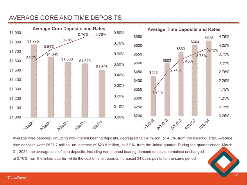 HISTORICAL RATE PAID AND BETAS ON CORE AND TIME DEPOSITS 17 (1) Core deposit beta excludes non - interest bearing accounts. 15% 18% 19% 21% 20% 0.82% 1.00% 1.11% 1.22% 1.21% 0.00% 0.25% 0.50% 0.75% 1.00% 1.25% 1.50% 1Q2023 2Q2023 3Q2023 4Q2023 1Q2024 0% 5% 10% 15% 20% 25% Core Deposit Beta Core Deposit Beta, cumulative Cost of Core Deposits (1) 30% 48% 60% 65% 71% 1.71% 2.74% 3.46% 3.78% 4.12% 0.00% 0.50% 1.00% 1.50% 2.00% 2.50% 3.00% 3.50% 4.00% 4.50% 1Q2023 2Q2023 3Q2023 4Q2023 1Q2024 0% 10% 20% 30% 40% 50% 60% 70% 80% Time Deposit Beta Time Deposit Beta, cumulative Cost of Time Deposits Time deposit betas lagged early in the cycle The cumulative core and time deposit betas are calculated as the average increase in the rate paid on interest - bearing core and time deposits, respectively, at each period presented divided by the average incremental increase in the federal reserve rate. Core deposit betas lagged early in the cycle