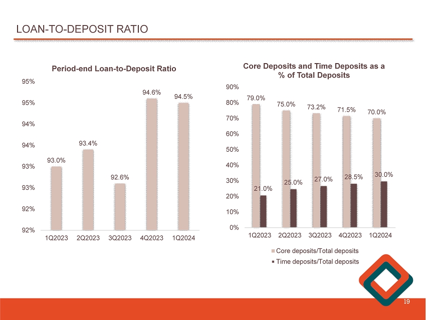 AVERAGE CORE AND TIME DEPOSITS 18 $1,775 $1,645 $1,588 $1,573 $1,506 0.53% 0.64% 0.70% 0.76% 0.76% 0.00% 0.10% 0.20% 0.30% 0.40% 0.50% 0.60% 0.70% 0.80% $1,000 $1,100 $1,200 $1,300 $1,400 $1,500 $1,600 $1,700 $1,800 $1,900 Average Core Deposits and Rates Average core deposits, including non - interest bearing deposits, decreased $ 67 . 4 million, or 4 . 3 % , from the linked quarter . Average time deposits were $ 627 . 7 million, an increase of $ 23 . 8 million, or 3 . 9 % , from the linked quarter . During the quarter - ended March 31 , 2024 , the average cost of core deposits, including non - interest bearing demand deposits, remained unchanged at 0 . 76 % from the linked quarter, while the cost of time deposits increased 34 basis points for the same period . ($ in millions) $428 $502 $563 $604 $628 1.71% 2.74% 3.46% 3.78% 4.12% 0.25% 0.75% 1.25% 1.75% 2.25% 2.75% 3.25% 3.75% 4.25% 4.75% $200 $250 $300 $350 $400 $450 $500 $550 $600 $650 Average Time Deposits and Rates