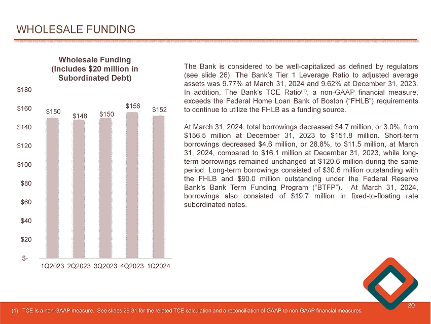 WHOLESALE FUNDING 20 $150 $148 $150 $156 $152 1Q2023 2Q2023 3Q2023 4Q2023 1Q2024 $- $20 $40 $60 $80 $100 $120 $140 $160 $180 Wholesale Funding (Includes $20 million in Subordinated Debt) The Bank is considered to be well - capitalized as defined by regulators ( see slide 26 ) . The Bank’s Tier 1 Leverage Ratio to adjusted average assets was 9 . 77 % at March 31 , 2024 and 9 . 62 % at December 31 , 2023 . In addition , The Bank’s TCE Ratio ( 1 ) , a non - GAAP financial measure, exceeds the Federal Home Loan Bank of Boston (“FHLB”) requirements to continue to utilize the FHLB as a funding source . At March 31 , 2024 , total borrowings decreased $ 4 . 7 million, or 3 . 0 % , from $ 156 . 5 million at December 31 , 2023 to $ 151 . 8 million . Short - term borrowings decreased $ 4 . 6 million, or 28 . 8 % , to $ 11 . 5 million , at March 31 , 2024 , compared to $ 16 . 1 million at December 31 , 2023 , while long - term borrowings remained unchanged at $ 120 . 6 million during the same period . Long - term borrowings consisted of $ 30 . 6 million outstanding with the FHLB and $ 90 . 0 million outstanding under the Federal Reserve Bank’s Bank Term Funding Program (“BTFP”) . At March 31 , 2024 , borrowings also consisted of $ 19 . 7 million in fixed - to - floating rate subordinated notes . (1) TCE is a non - GAAP measure. See slides 29 - 31 for the related TCE calculation and a reconciliation of GAAP to non - GAAP financial measures .