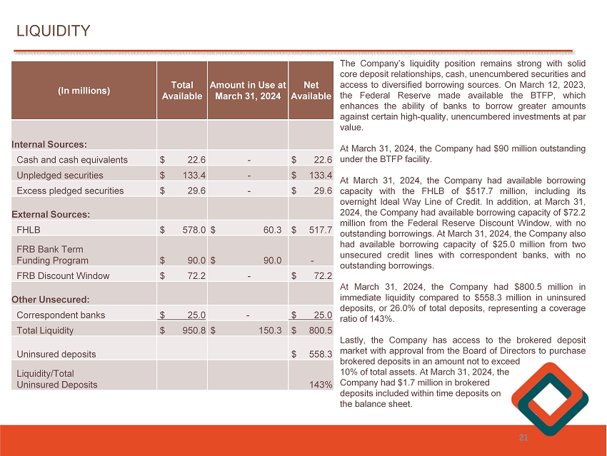 21 The Company’s liquidity position remains strong with solid core deposit relationships, cash, unencumbered securities and access to diversified borrowing sources . On March 12 , 2023 , the Federal Reserve made available the BTFP, which enhances the ability of banks to borrow greater amounts against certain high - quality, unencumbered investments at par value . At March 31 , 2024 , the Company had $ 90 million outstanding under the BTFP facility . At March 31 , 2024 , the Company had available borrowing capacity with the FHLB of $ 517 . 7 million, including its overnight Ideal Way Line of Credit . In addition, at March 31 , 2024 , the Company had available borrowing capacity of $ 72 . 2 million from the Federal Reserve Discount Window, with no outstanding borrowings . At March 31 , 2024 , the Company also had available borrowing capacity of $ 25 . 0 million from two unsecured credit lines with correspondent banks, with no outstanding borrowings . At March 31 , 2024 , the Company had $ 800 . 5 million in immediate liquidity compared to $ 558 . 3 million in uninsured deposits, or 26 . 0 % of total deposits, representing a coverage ratio of 143 % . Lastly, the Company has access to the brokered deposit market with approval from the Board of Directors to purchase brokered deposits in an amount not to exceed 10 % of total assets . At March 31 , 2024 , the Company had $ 1 . 7 million in brokered deposits included within time deposits on t he balance sheet . LIQUIDITY Net Available Amount in Use at March 31, 2024 Total Available (In millions) Internal Sources: $ 22.6 - $ 22.6 Cash and cash equivalents $ 133.4 - $ 133.4 Unpledged securities $ 29.6 - $ 29.6 Excess pledged securities External Sources: $ 517.7 $ 60.3 $ 578.0 FHLB - $ 90.0 $ 90.0 FRB Bank Term Funding Program $ 72.2 - $ 72.2 FRB Discount Window Other Unsecured: $ 25.0 - $ 25.0 Correspondent banks $ 800.5 $ 150.3 $ 950.8 Total Liquidity $ 558.3 Uninsured deposits 143 % Liquidity/Total Uninsured Deposits
