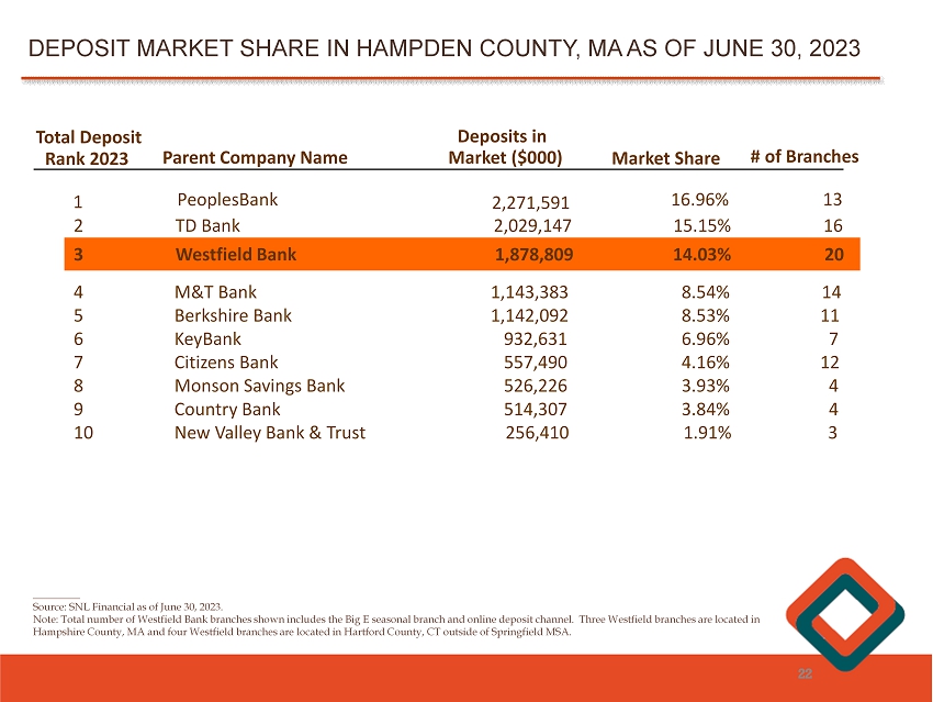________ Source: SNL Financial as of June 30, 2023. Note: Total number of Westfield Bank branches shown includes the Big E seasonal branch and online deposit channel. Three Wes tfi eld branches are located in Hampshire County, MA and four Westfield branches are located in Hartford County, CT outside of Springfield MSA. DEPOSIT MARKET SHARE IN HAMPDEN COUNTY, MA AS OF JUNE 30, 2023 22 Total Deposit Rank 2023 Parent Company Name Deposits in Market ($000) Market Share # of Branches 1 PeoplesBank 2,271,591 16.96% 13 1,762,519 13.1% 20 3 Westfield Bank 1,878,809 14.03% 20 2 TD Bank 2,029,147 15.15 % 16 4 M&T Bank 1,143,383 8.54% 14 5 Berkshire Bank 1,142,092 8.53% 11 6 KeyBank 932,631 6.96% 7 7 Citizens Bank 557,490 4.16% 12 8 Monson Savings Bank 526,226 3.93% 4 9 Country Bank 514,307 3.84% 4 10 New Valley Bank & Trust 256,410 1.91% 3