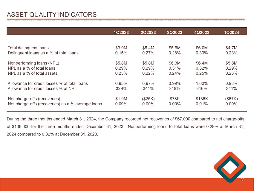 ASSET QUALITY INDICATORS 23 1Q2024 4Q2023 3Q2023 2Q2023 1Q2023 $4.7M $6.0M $5.6M $5.4M $3.0M Total delinquent loans 0.23% 0.30% 0.28% 0.27% 0.15% Delinquent loans as a % of total loans $5.8M $6.4M $6.3M $5.8M $5.8M Nonperforming loans (NPL) 0.29% 0.32% 0.31% 0.29% 0.29% NPL as a % of total loans 0.23% 0.25% 0.24% 0.22% 0.23% NPL as a % of total assets 0.98% 1.00% 0.99% 0.97% 0.95% Allowance for credit losses % of total loans 341% 316% 318% 341% 329% Allowance for credit losses % of NPL ($67K) $136K $78K ($25K) $1.9M Net charge - offs (recoveries) 0.00% 0.01% 0.00% 0.00% 0.09% Net charge - offs (recoveries) as a % average loans During the three months ended March 31 , 2024 , the Company recorded net recoveries of $ 67 , 000 compared to net charge - offs of $ 136 , 000 for the three months ended December 31 , 2023 . Nonperforming loans to total loans were 0 . 29 % at March 31 , 2024 compared to 0 . 32 % at December 31 , 2023 .