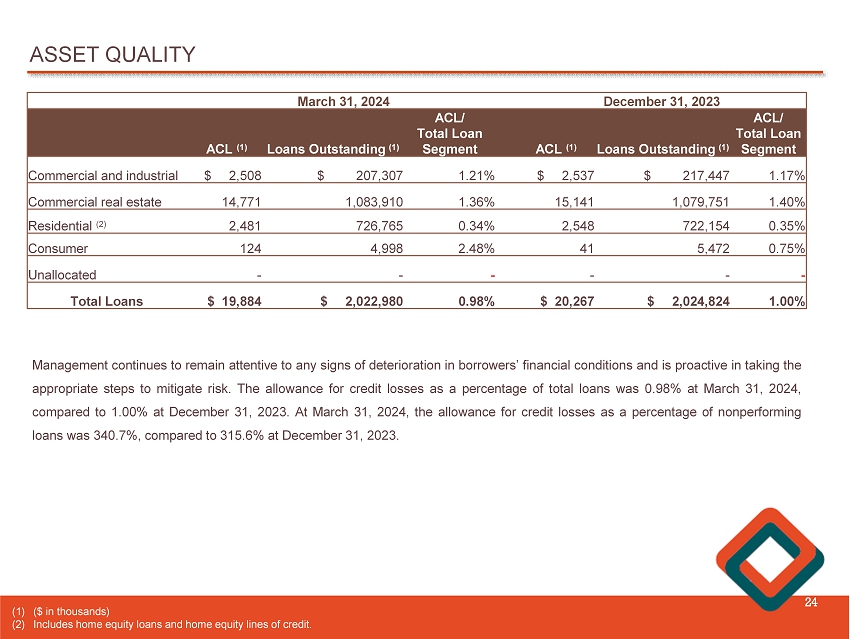 ASSET QUALITY 24 Management continues to remain attentive to any signs of deterioration in borrowers’ financial conditions and is proactive in taking the appropriate steps to mitigate risk . The allowance for credit losses as a percentage of total loans was 0 . 98 % at March 31 , 2024 , compared to 1 . 00 % at December 31 , 2023 . At March 31 , 2024 , the allowance for credit losses as a percentage of nonperforming loans was 340 . 7 % , compared to 315 . 6 % at December 31 , 2023 . December 31, 2023 March 31, 2024 ACL / Total Loan Segment Loans Outstanding (1) ACL (1) ACL / Total Loan Segment Loans Outstanding (1) ACL (1) 1.17% $ 217,447 $ 2,537 1.21% $ 207,307 $ 2,508 Commercial and industrial 1.40% 1,079,751 15,141 1.36% 1,083,910 14,771 Commercial real estate 0.35% 722,154 2,548 0.34% 726,765 2,481 Residential (2) 0.75% 5,472 41 2.48% 4,998 124 Consumer - - - - - - Unallocated 1.00% $ 2,024,824 $ 20,267 0.98% $ 2,022,980 $ 19,884 Total Loans (1) ( $ in thousands) (2) Includes home equity loans and home equity lines of credit .